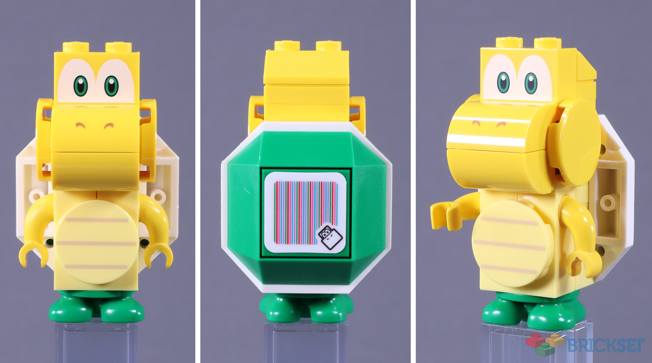 This simple green-shelled Koopa is identical to the one found in 71365 Piranha Plant Power Slide. The technique has been used on other figures, like Yoshi, but I still appreciate the perfect use of 1x2 curved slopes for the nose and mouth.