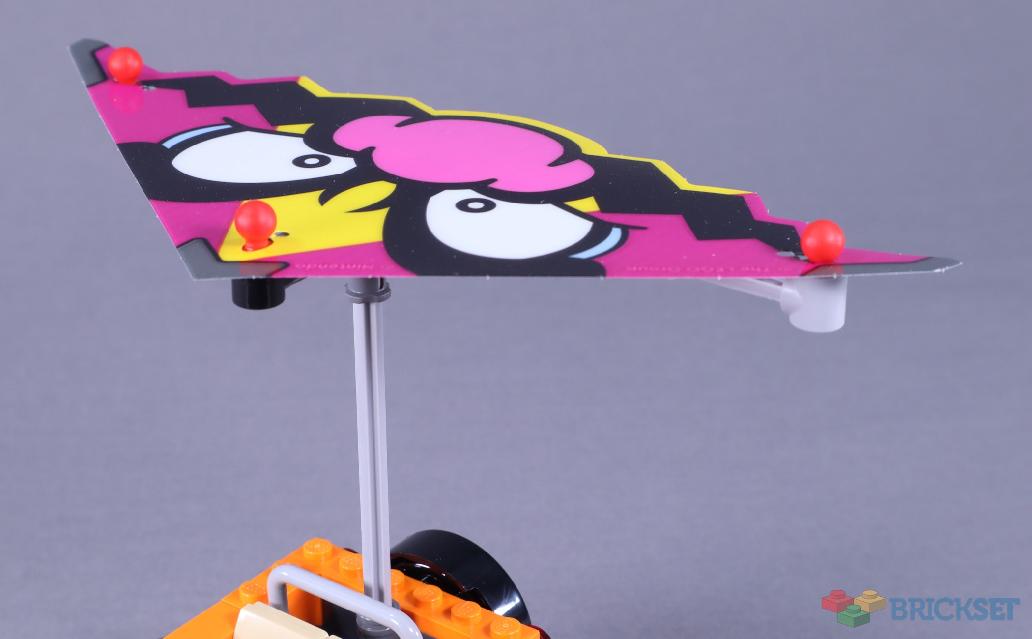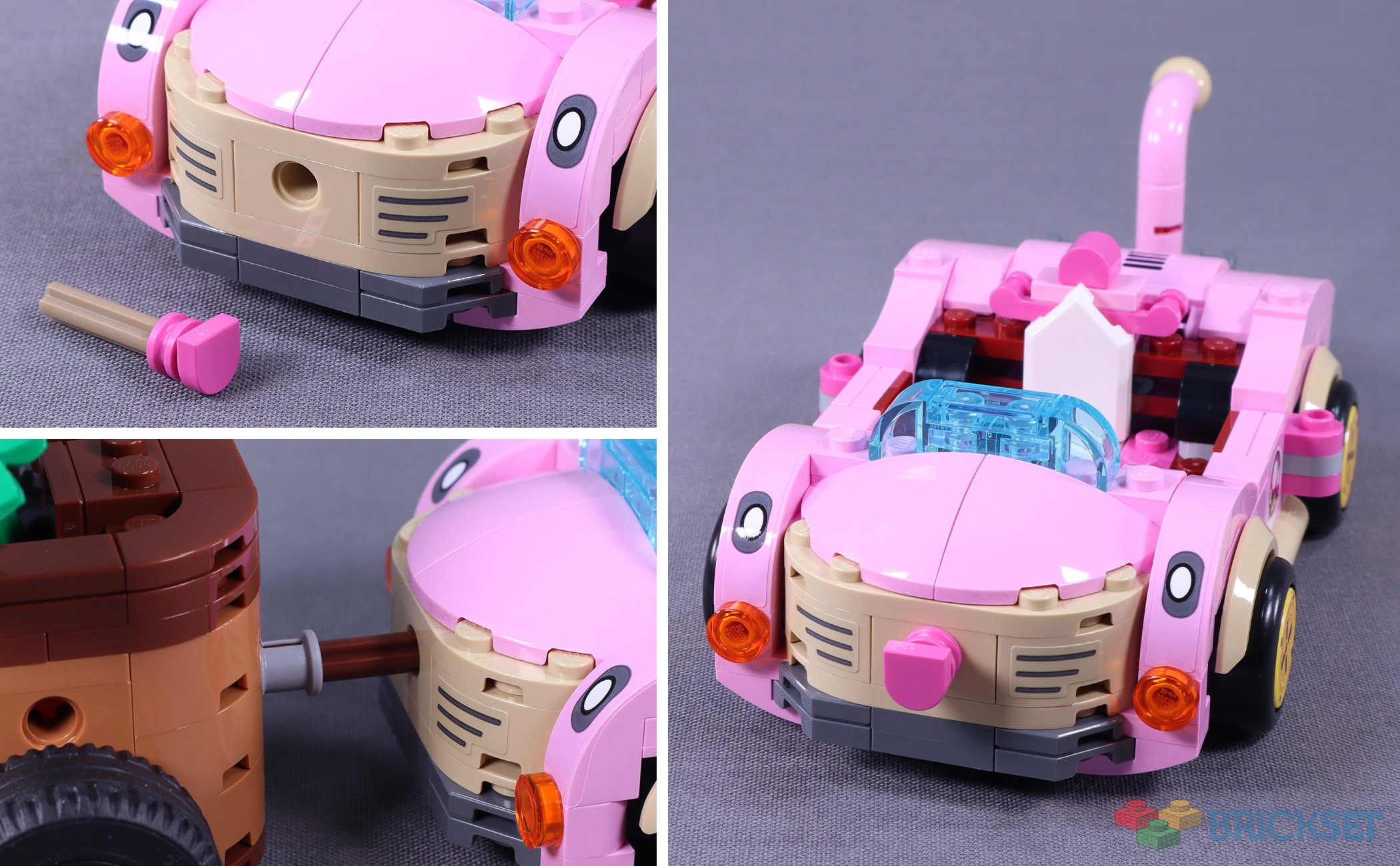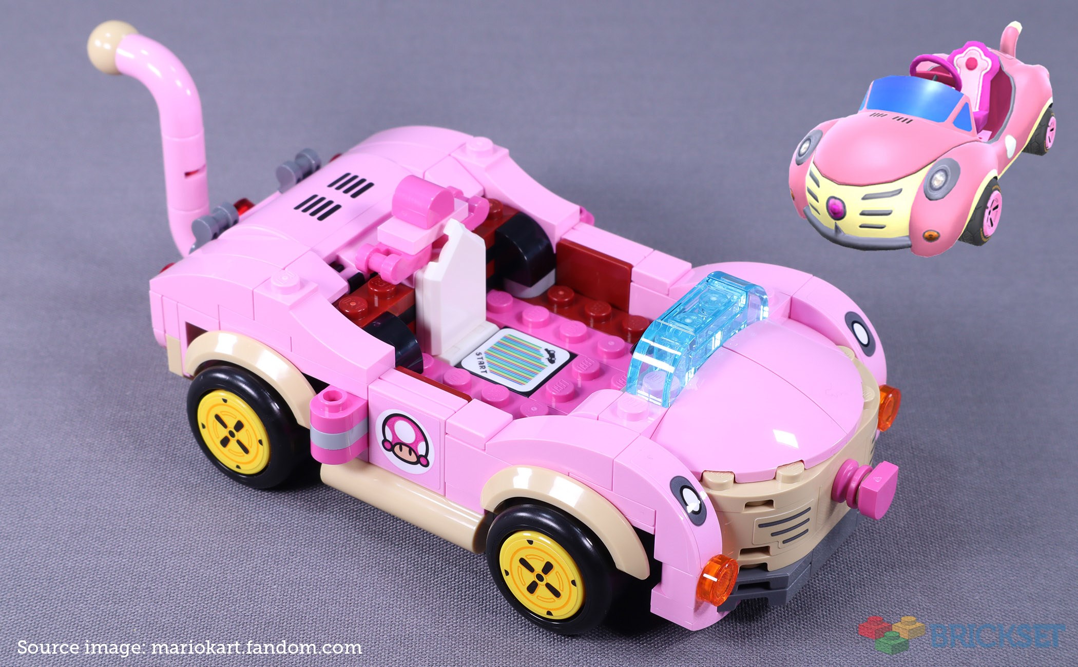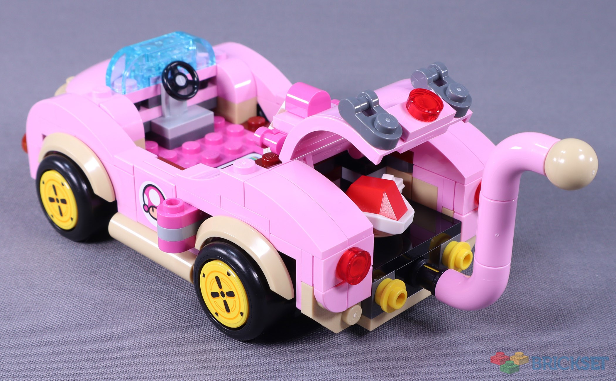 Toadette’s kart of choice in this set is the Cat Cruiser and uses the standard kart barcode. The in-game car is much bubblier than its LEGO counterpart, but it looks decent with a little assistance from detailing illustrated with stickers. Several elements have been recoloured in bright pink for this model, most notably, the versatile 1x1 d-snot. The mudguards are also new in tan.