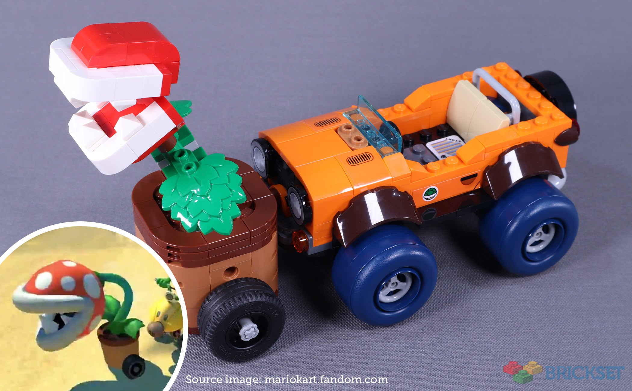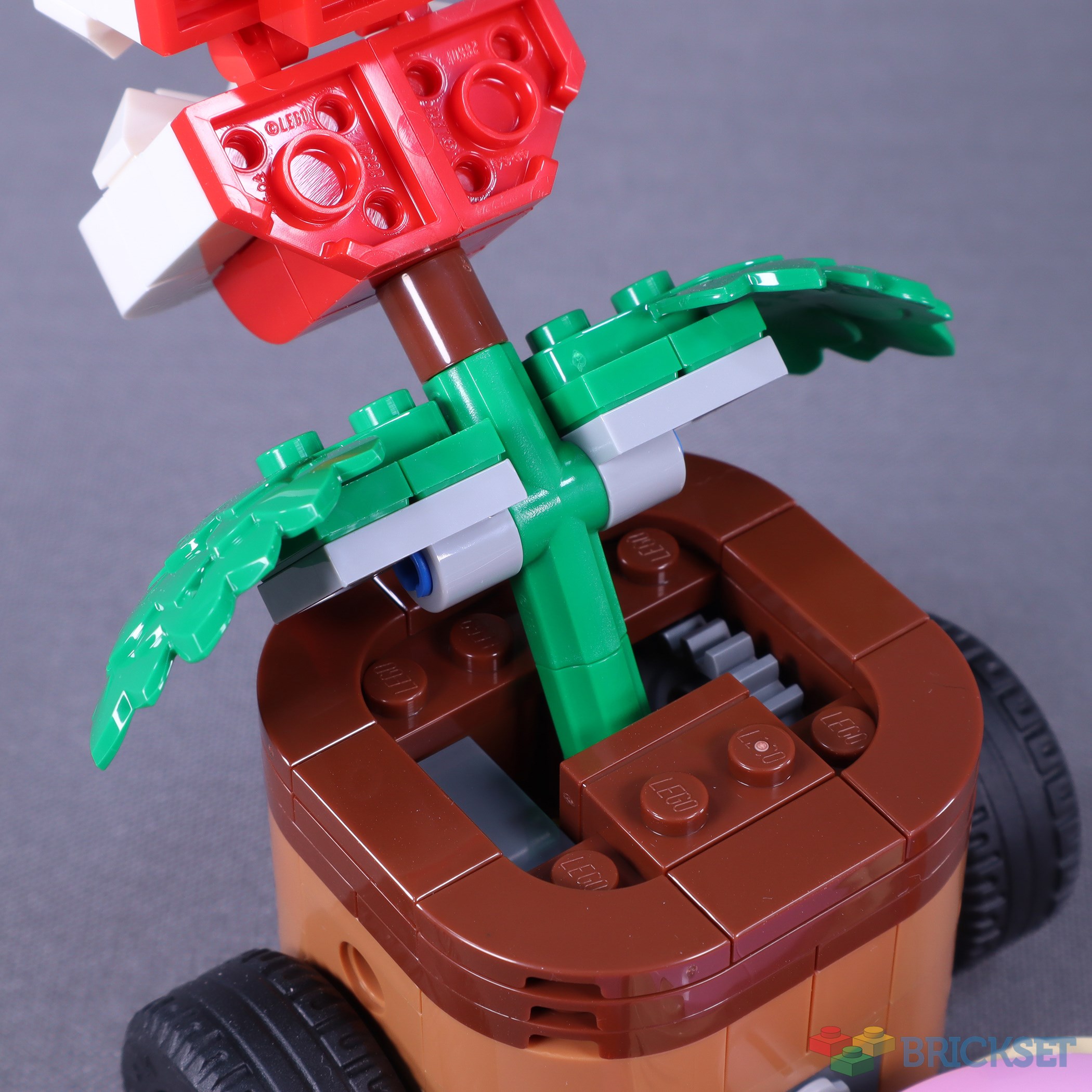 The Piranha Plant Power-Up’s pot understandably had to have its scale and shape altered to accommodate the Technic mechanism within. As a result, the plant’s container appears slightly awkward as a simple, smooth cylinder. In-game, the pot and its wheels are smaller while the Piranha Plant’s head is much larger.