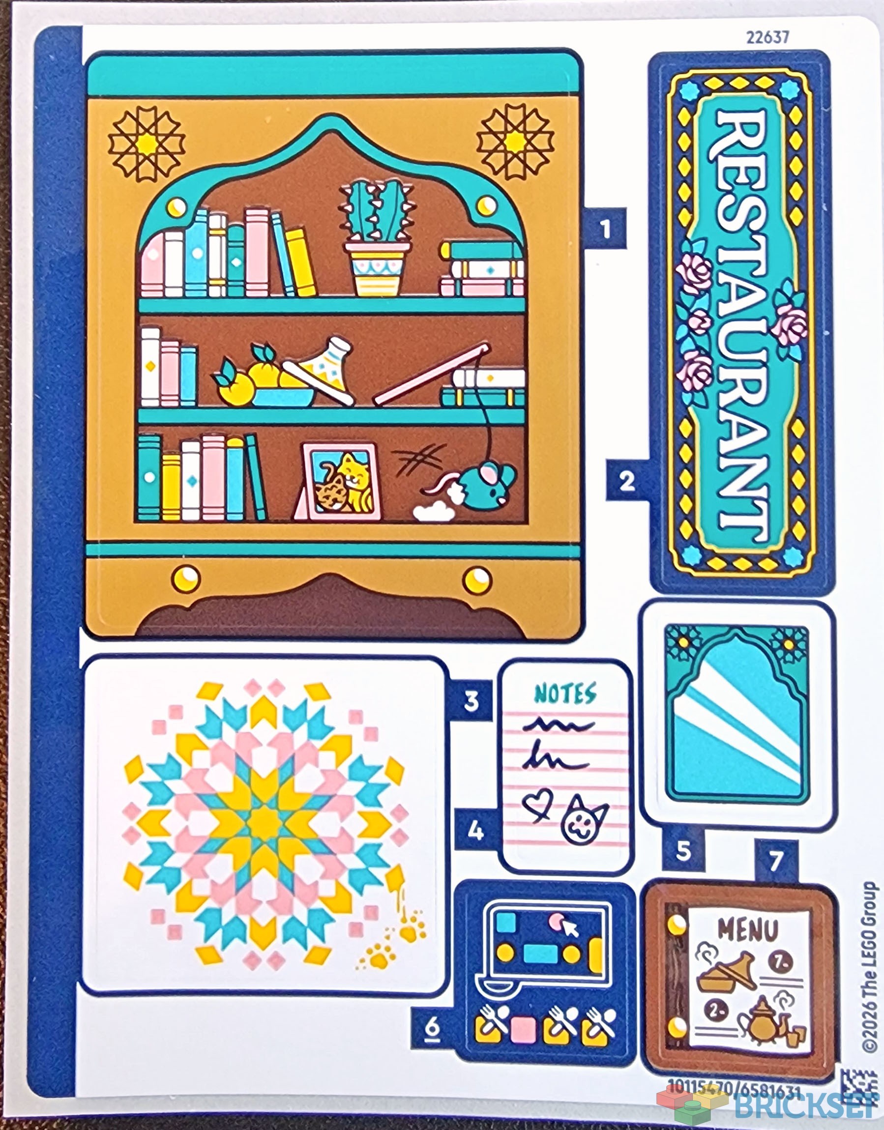 Inside the perfect box there are nine numbered bags, two 8x16 plates, and an instruction package with a large instruction book and a sticker sheet. I was surprised to see that for a set this size, there were only seven stickers! Note that three of the stickers have something indicating that this is a restaurant, as there is little else in the build that suggests that's what the building is.