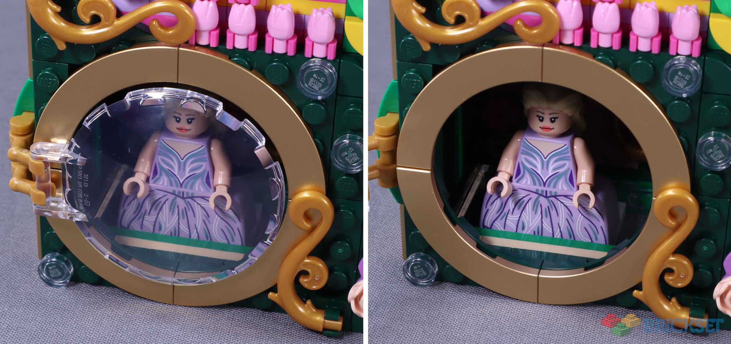 Glinda is displayed in the opposing corner to Elphaba, as far away as possible—is this symbolic of the emotional and physical distance between the two witches? Her characteristic bubble is supported on a sturdy hinge, and the transparent bubble motif is repeated subtly nearby with 1x1 transparent clear tiles. If viewed from below, she appears suspended within the bubble, but from other angles the slightly unsightly green and tan edges of the build’s underside start to show. (Similarly, the whole display would not look great if mounted too high on the wall.)
