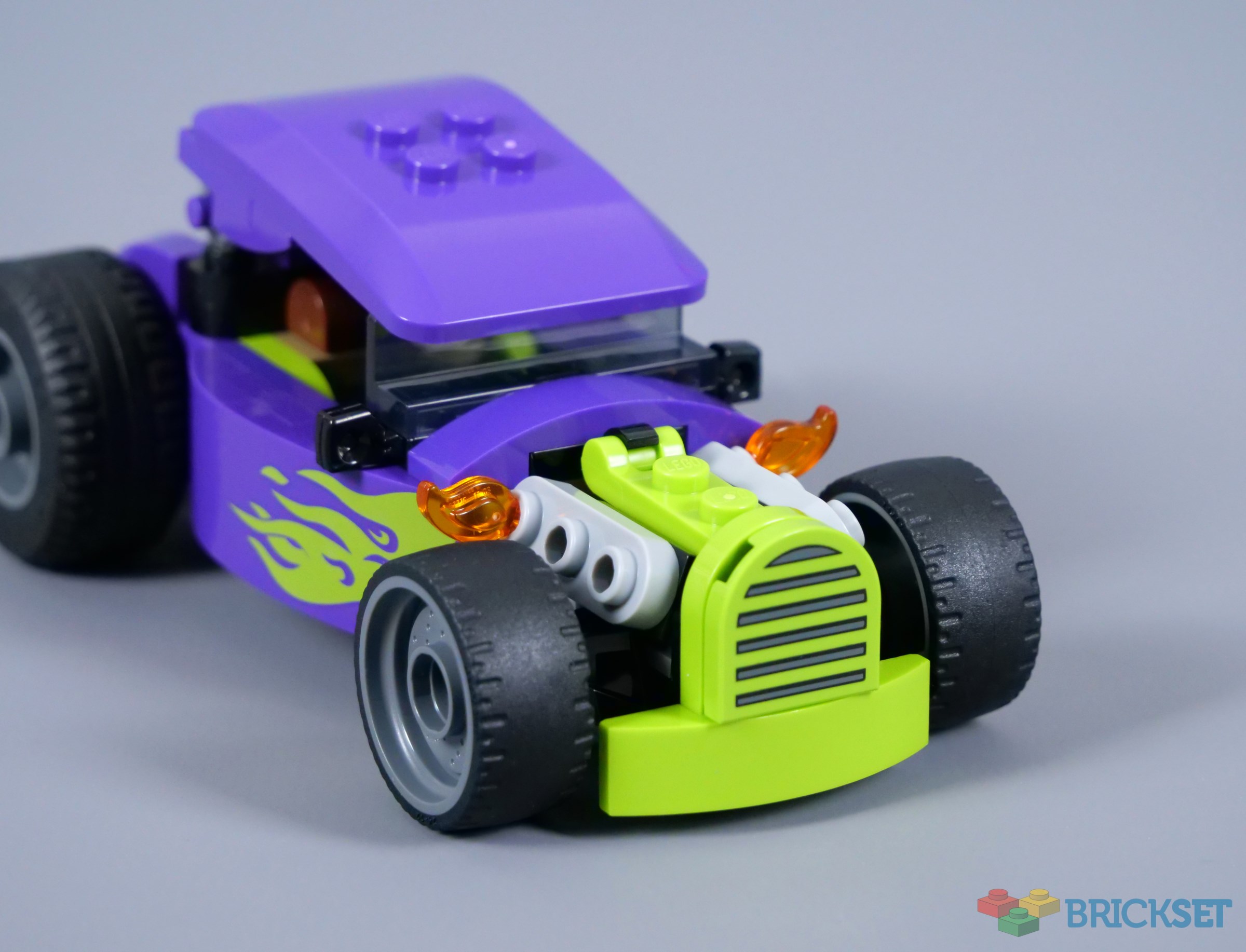 Though it looks tight with the angled roof, there is ample space for the driver. This roof element, the 2x2 plates with bars underneath and the 1x2 inverted curved slopes are each new in purple and they combine well. The printed flames are a little disappointing though, since the lime green designs are noticeably duller than the nearby lime green pieces.