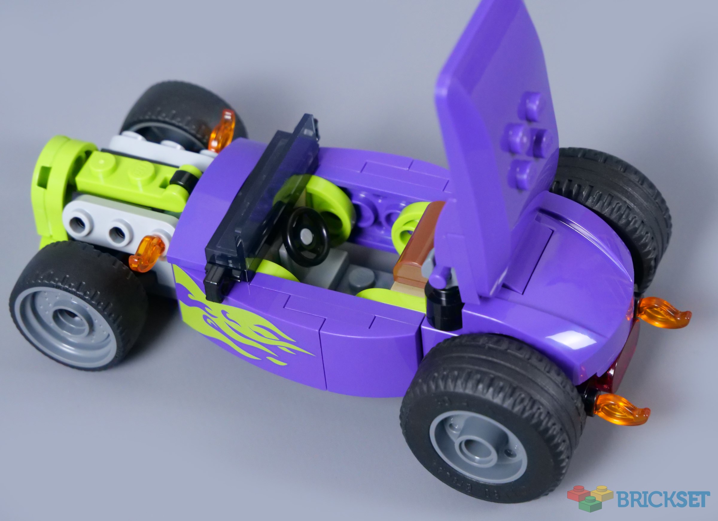 The bonnet element used towards the back looks excellent, with another pair of fiery exhausts beside a trans-red light underneath. Maybe the dark bluish grey clips supporting the roof could have been hidden, although visible mechanical details are a standard feature of real hot rods.