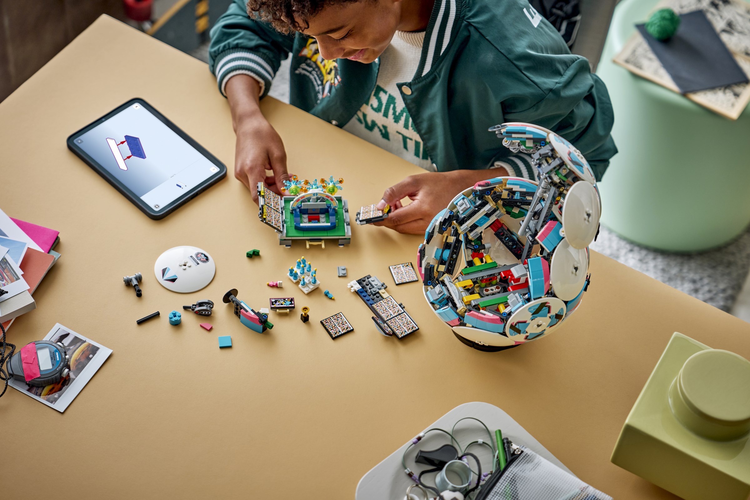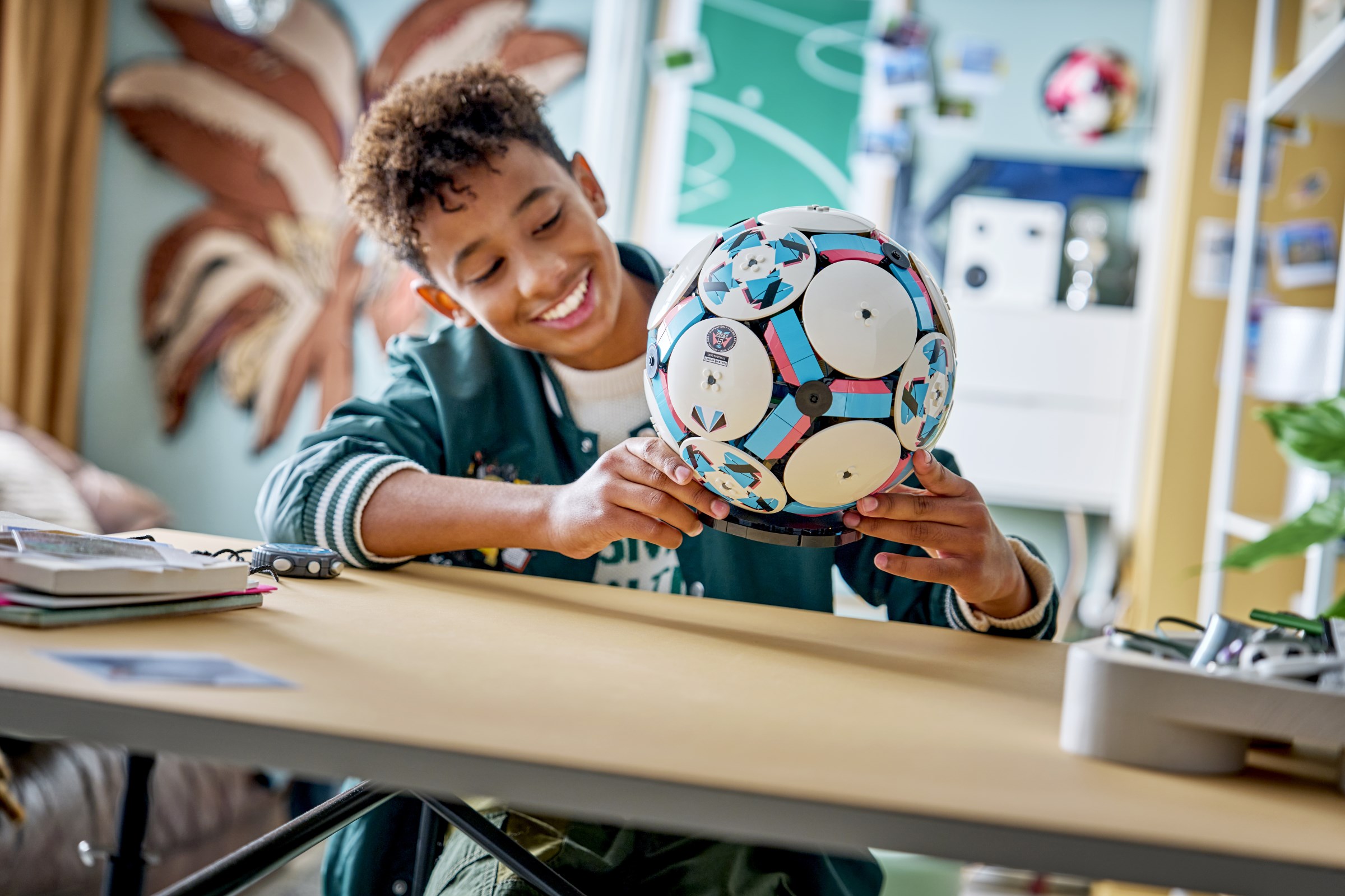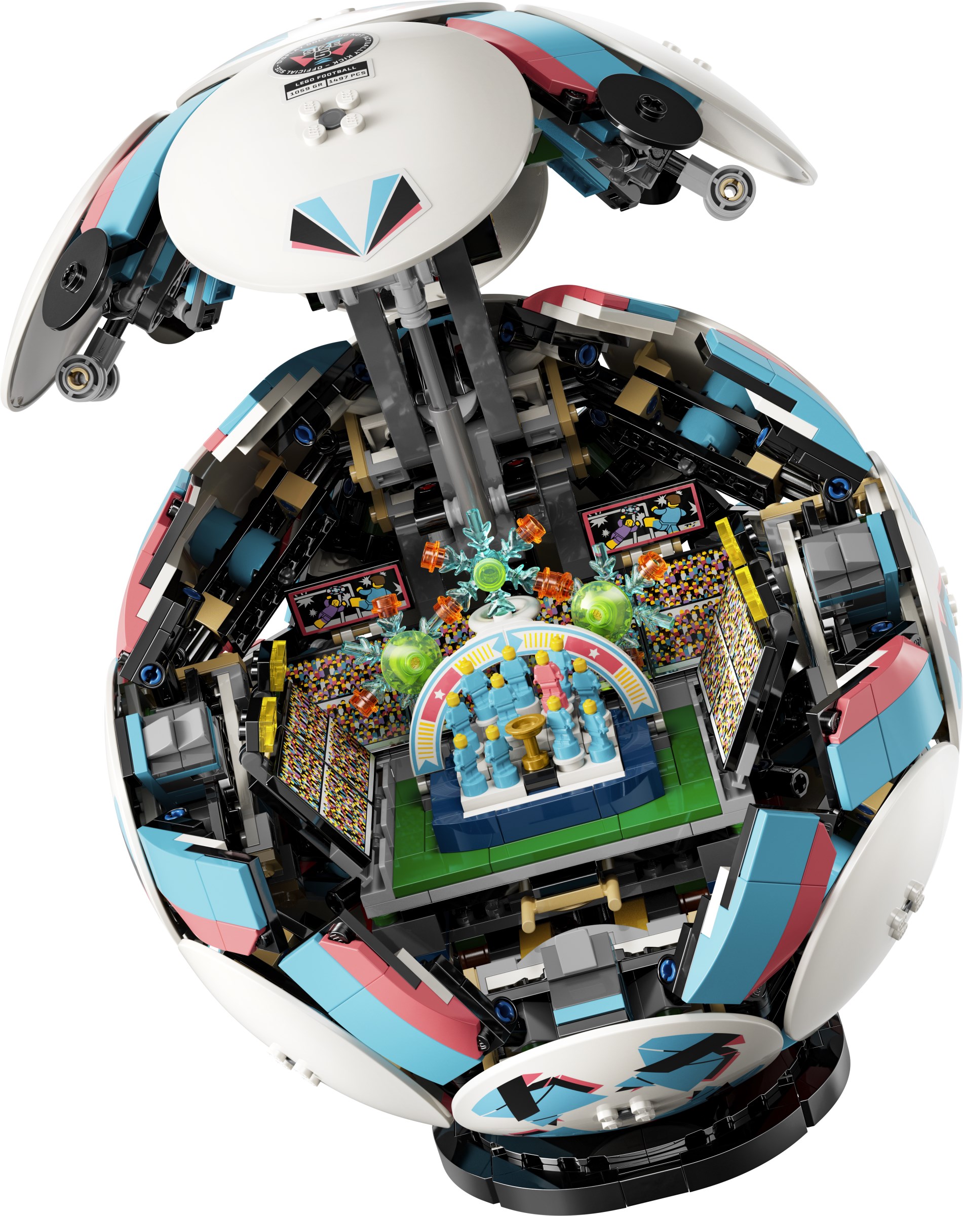 The collectable DIY display model includes LEGO Technic elements to achieve a rounded shape, and the outside of the ball features 6 stylish deco discs, while inside there’s an exciting mini stadium celebration scene waiting to be discovered. Kids can press the button and watch the moment the football player figures celebrate a win, with fireworks popping off behind the stage. Other fun stadium details include a small golden trophy toy in the centre and big screens.