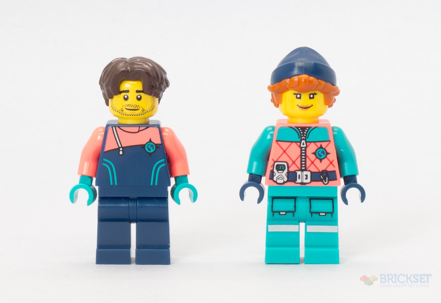 Once again, a minifigure is included for each activity, one male, one female. The scientist studying the penguins is wearing a dark blue and teal jacket with a small emblem that looks like a compass rose with an S or a path inside it. He has floppy brown hair and and two happy expressions on his stubble-dotted face. The hair can be swapped for a helmet when on the water.