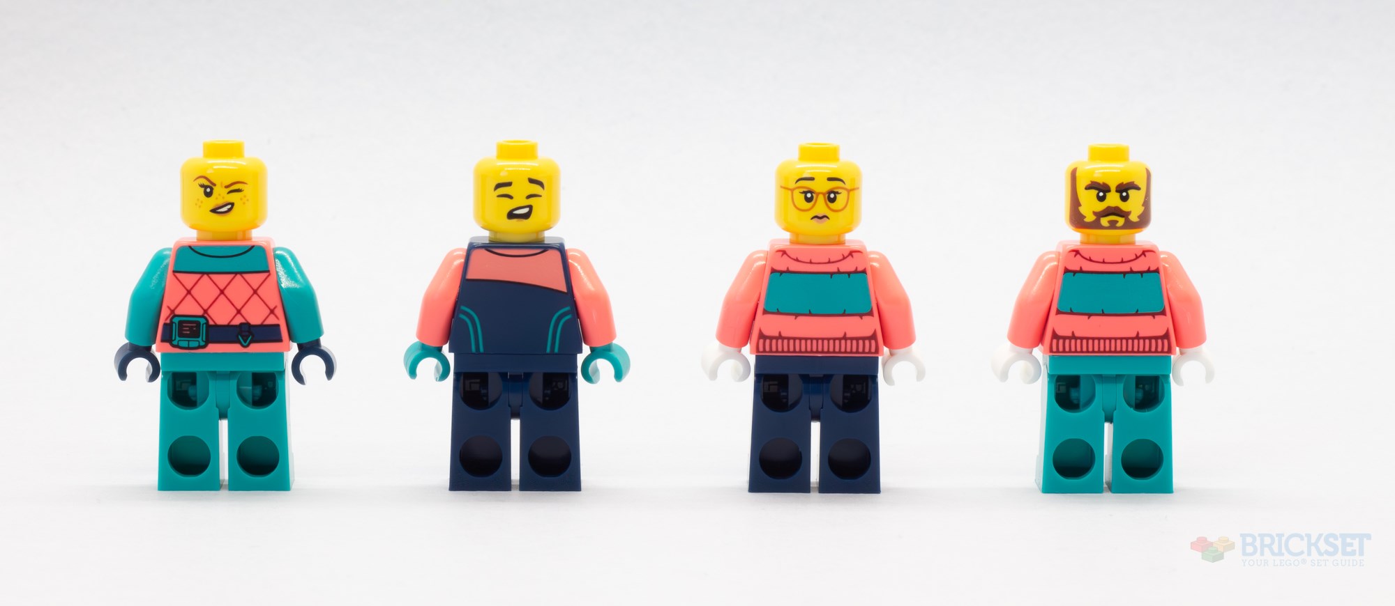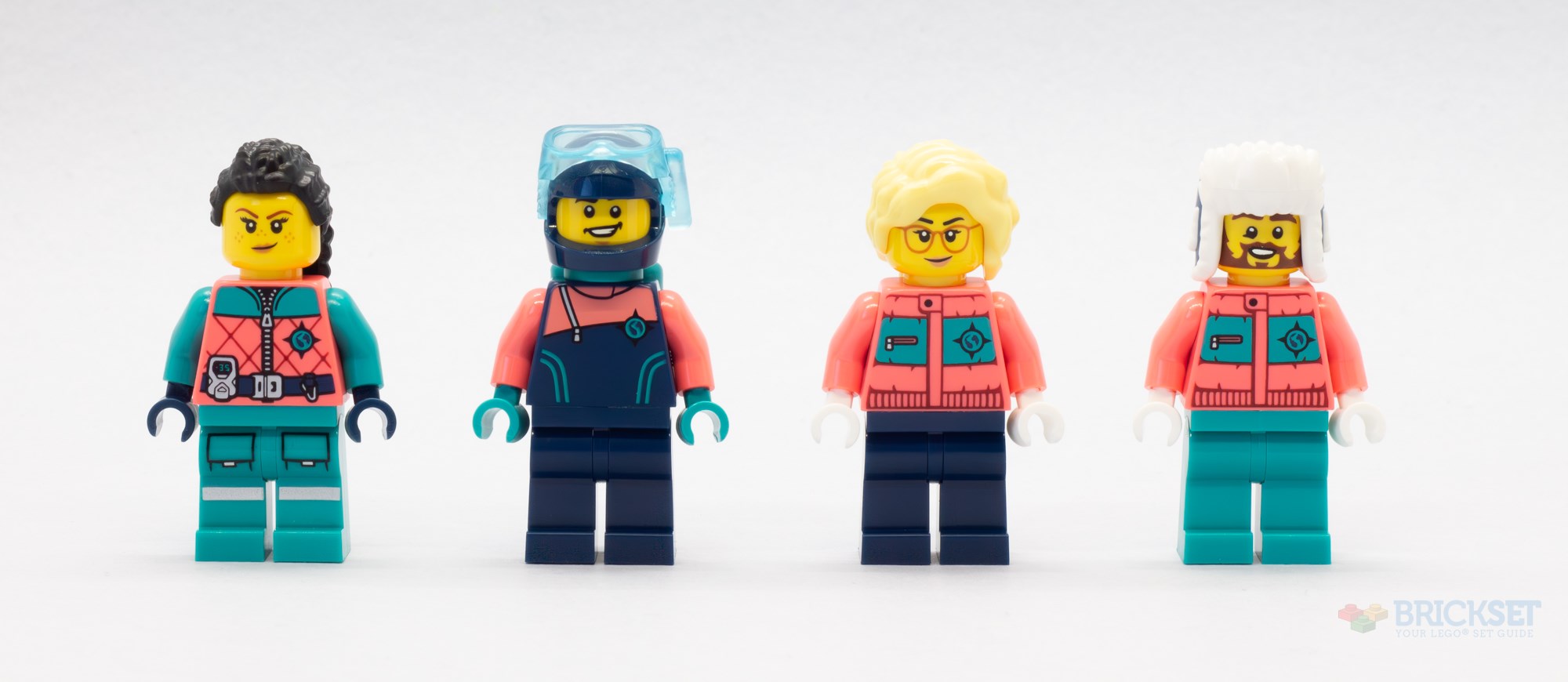The whale scientist looks to be wearing a much warmer coral padded jacket with teal arms, which zips up the middle, and also includes the same compass emblem. The outfit is finished with a utility belt to which a few pieces of equipment are attached, and the same teal legs as the explorer astronaut above. I like the dual-moulded beanie hat, and her two expressions include a satisfied smile on one side and a more worried or confused mouth beneath orange safety goggles on the other.