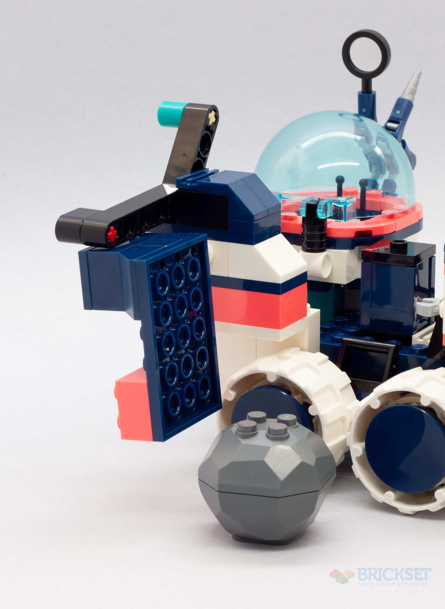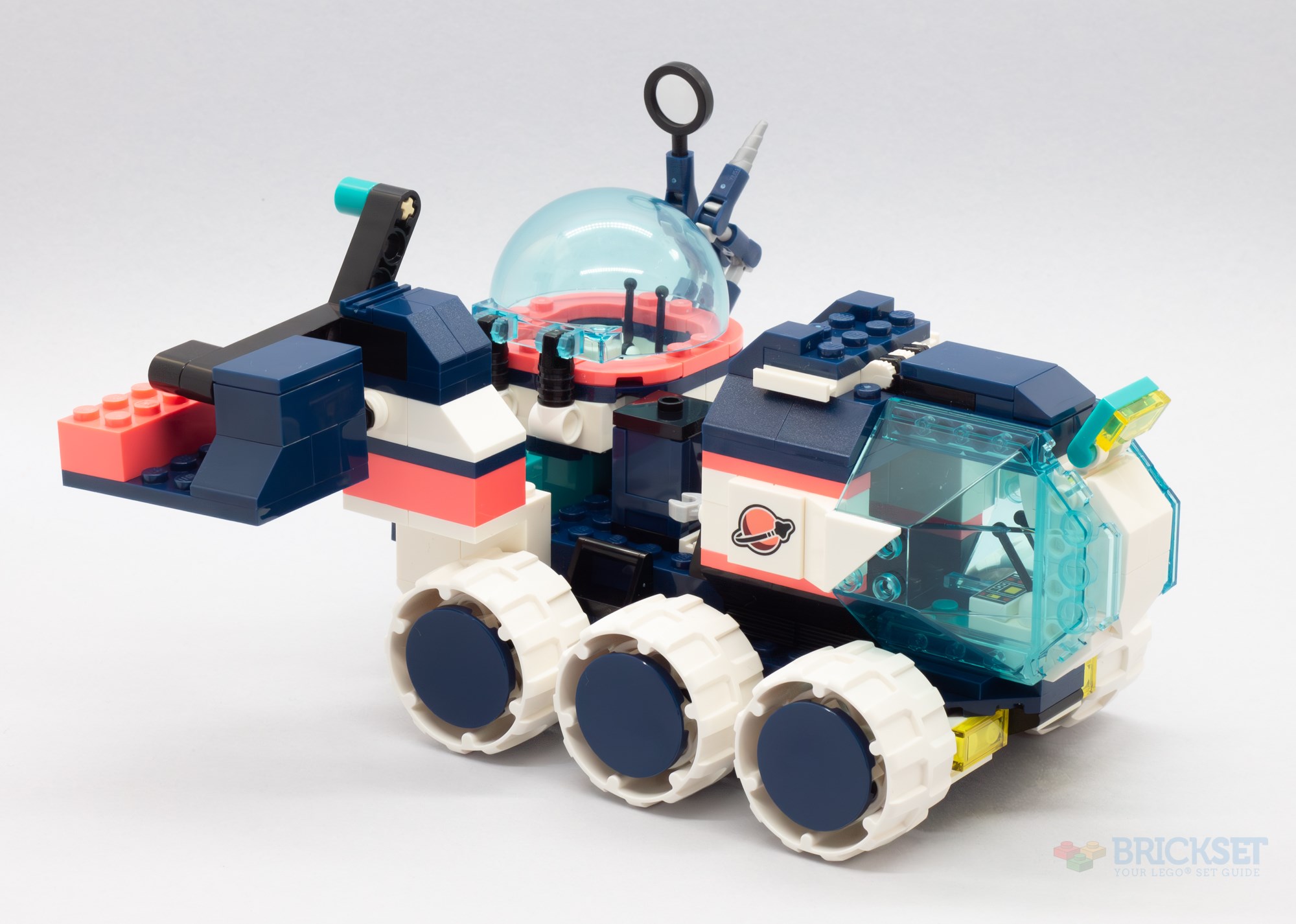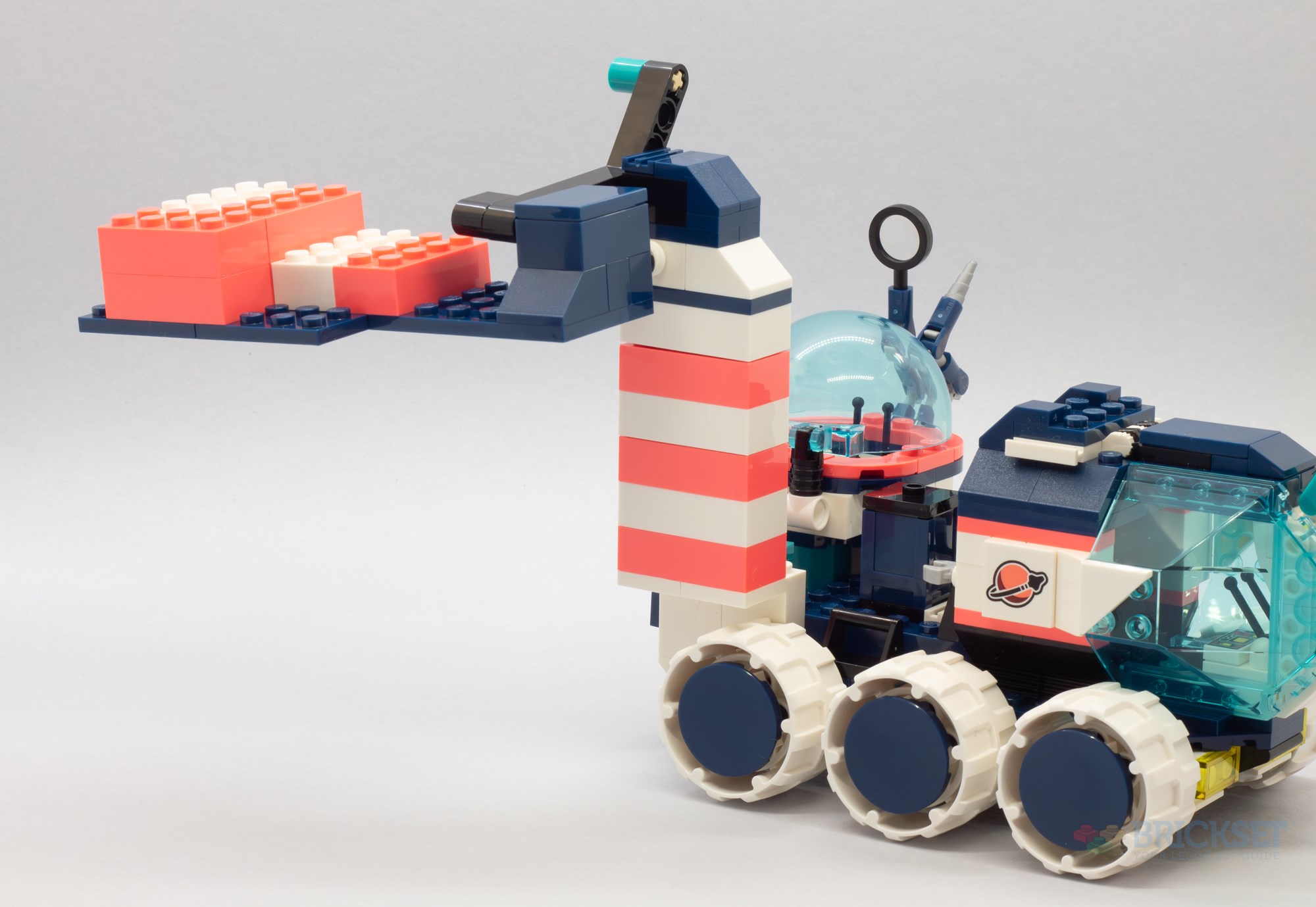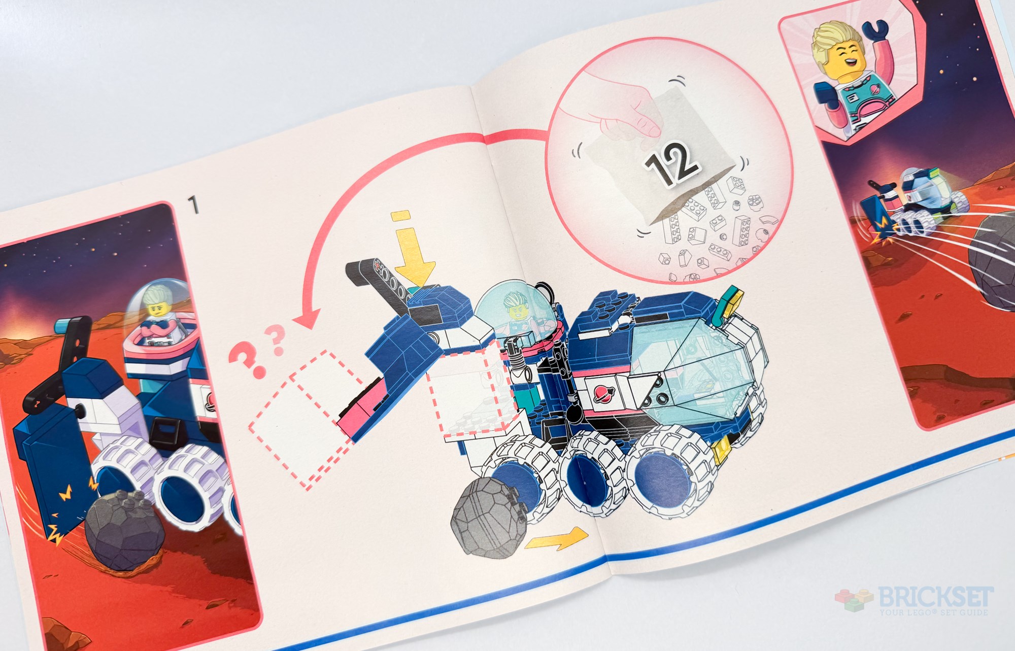 The build phase has us using a couple of bags of bricks to construct a six-wheeled Mars buggy. I quite like most of the design—the cockpit lifts forwards on hinges to allow access to the single seat cabin, there's a loading bay in the middle with a storage crate, and a second seating area beneath an observation dome houses controls for a robotic drill and a magnifying glass. The strange blocky contraption at the rear on the right, however, is very crudely built!