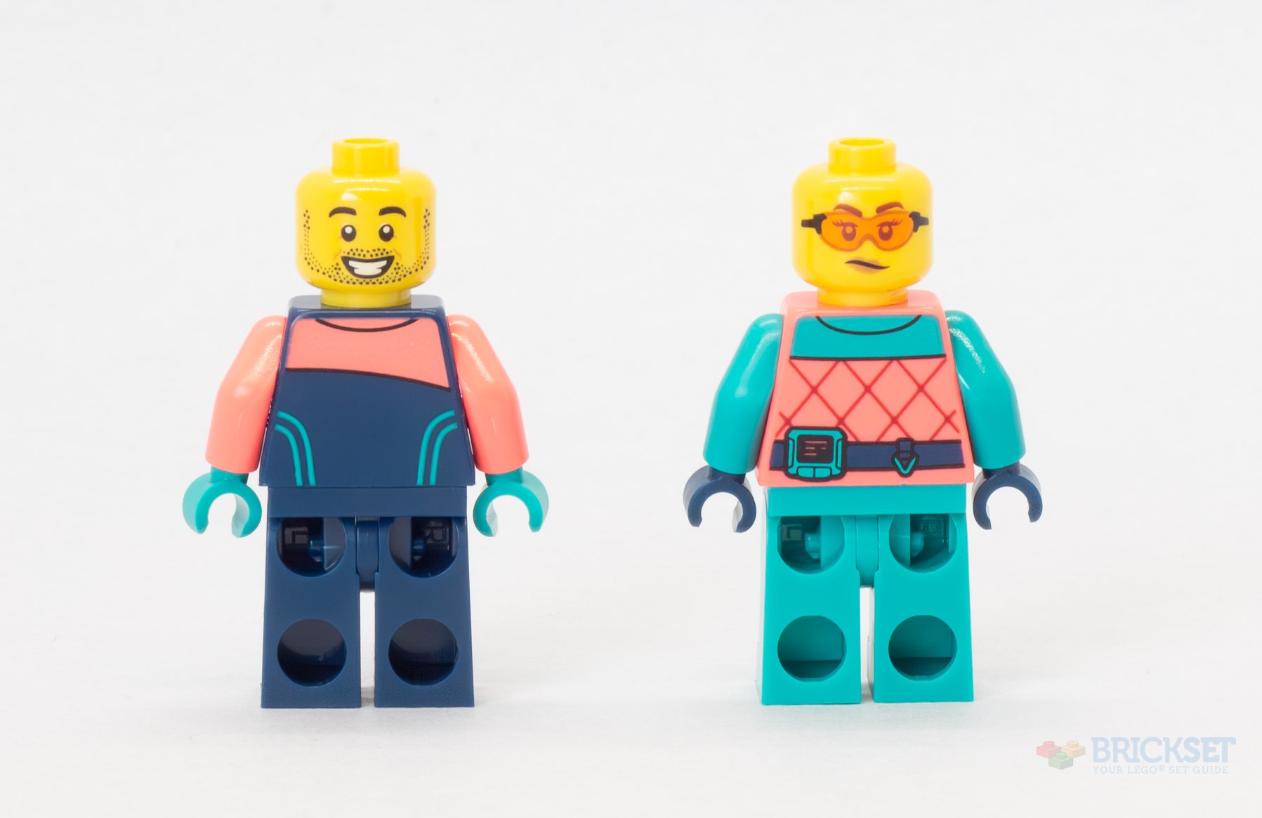 As is the pattern now, each mission contains its own minifigure. The first two repeat the outfits from the Antarctic set, although this time the dark blue and coral jacket is repurposed as a diving suit, complete with teal air tanks and a snorkel. The female scientist has two very determined expressions, one with a distinct squint (perhaps the bright sunlight reflecting of the snow is to blame). The diver has a confident smile on one side, and an unusual closed-eye, open-mouth expression on the other.