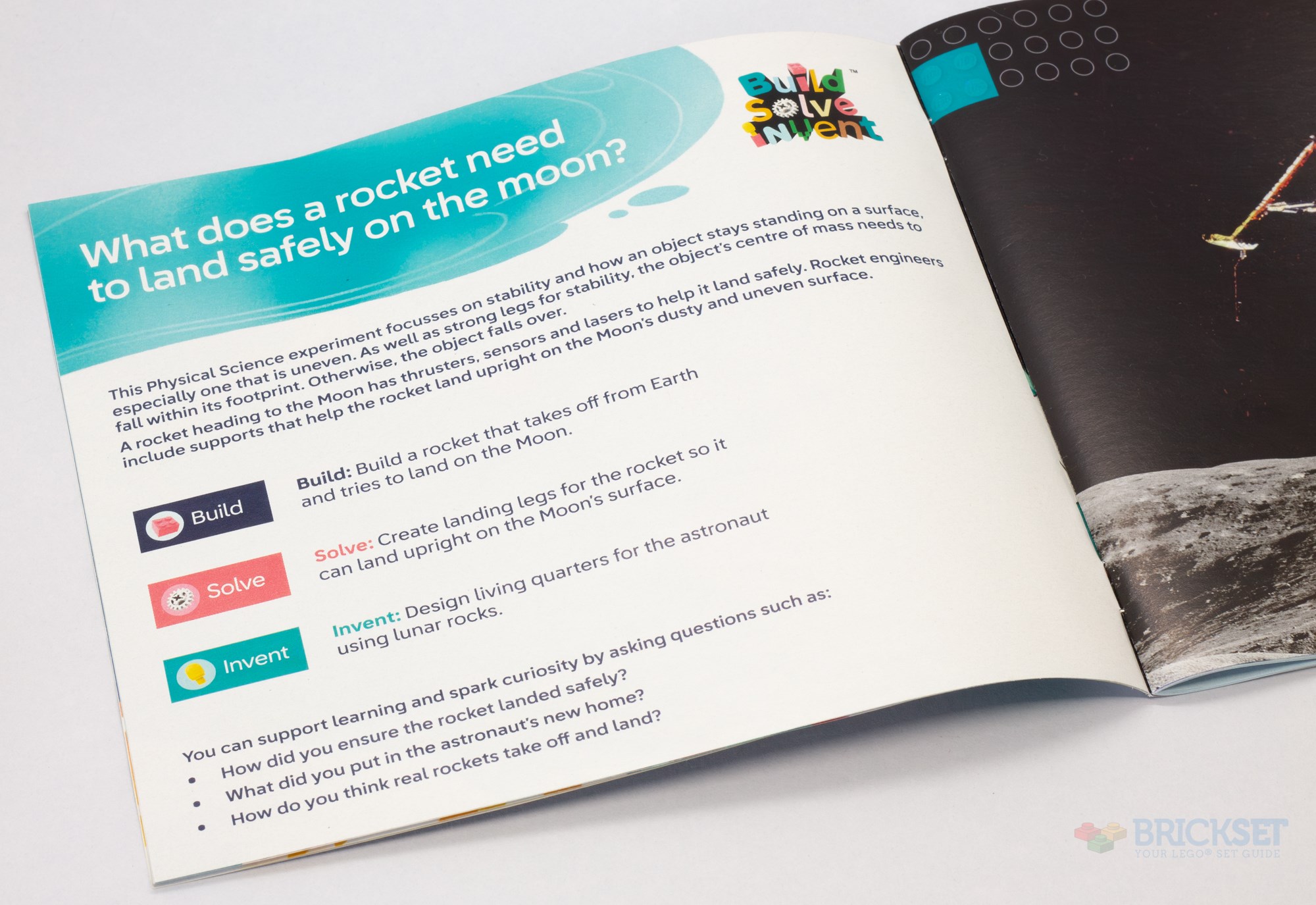 - The first is intended to teach stability—children are asked to build a rocket and a small section of Earth, space, and the Moon, solve the problem of the rocket falling over by designing a landing structure, and invent a small lunar base for the astronauts.