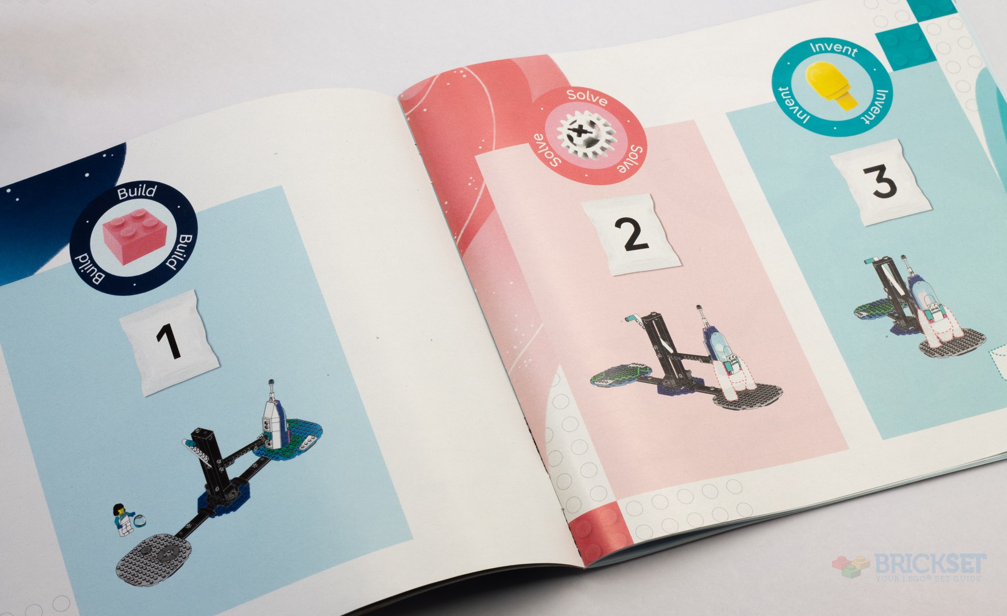 The four LEGO Education Science Kit sets are designed to teach children about a specific area of science by providing them with a framework to both learn and play at the same time. The four sets available now focus on space exploration and animal conservation. Explained at the front of the first instruction manual in each set, the "Kits" contain two or four experiments with three "phases" of play: Build, Solve, and Invent.