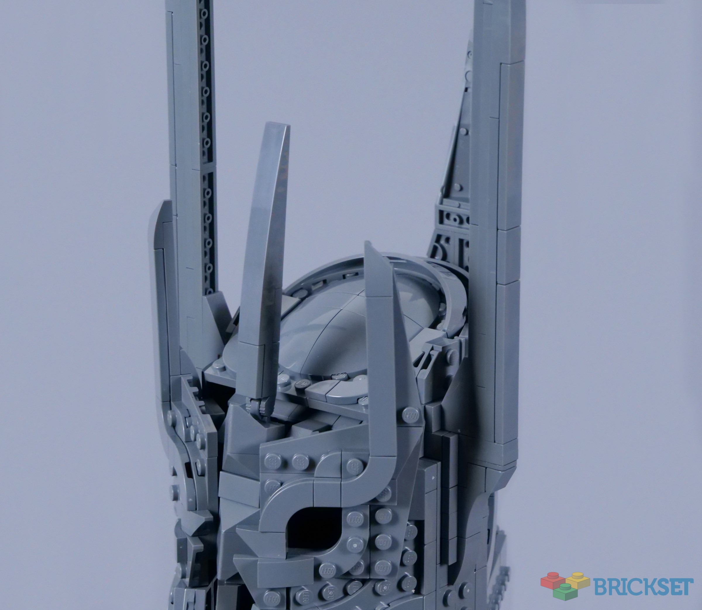 I think Sauron's helmet is well-suited to a LEGO model, without too many rounded sections and featuring complex surface detail. This helmet looks very slim, but its proportions are accurate to the opening sequence in The Fellowship of the Ring, topped with giant spikes and capturing the menace of Sauron's appearance in the film.