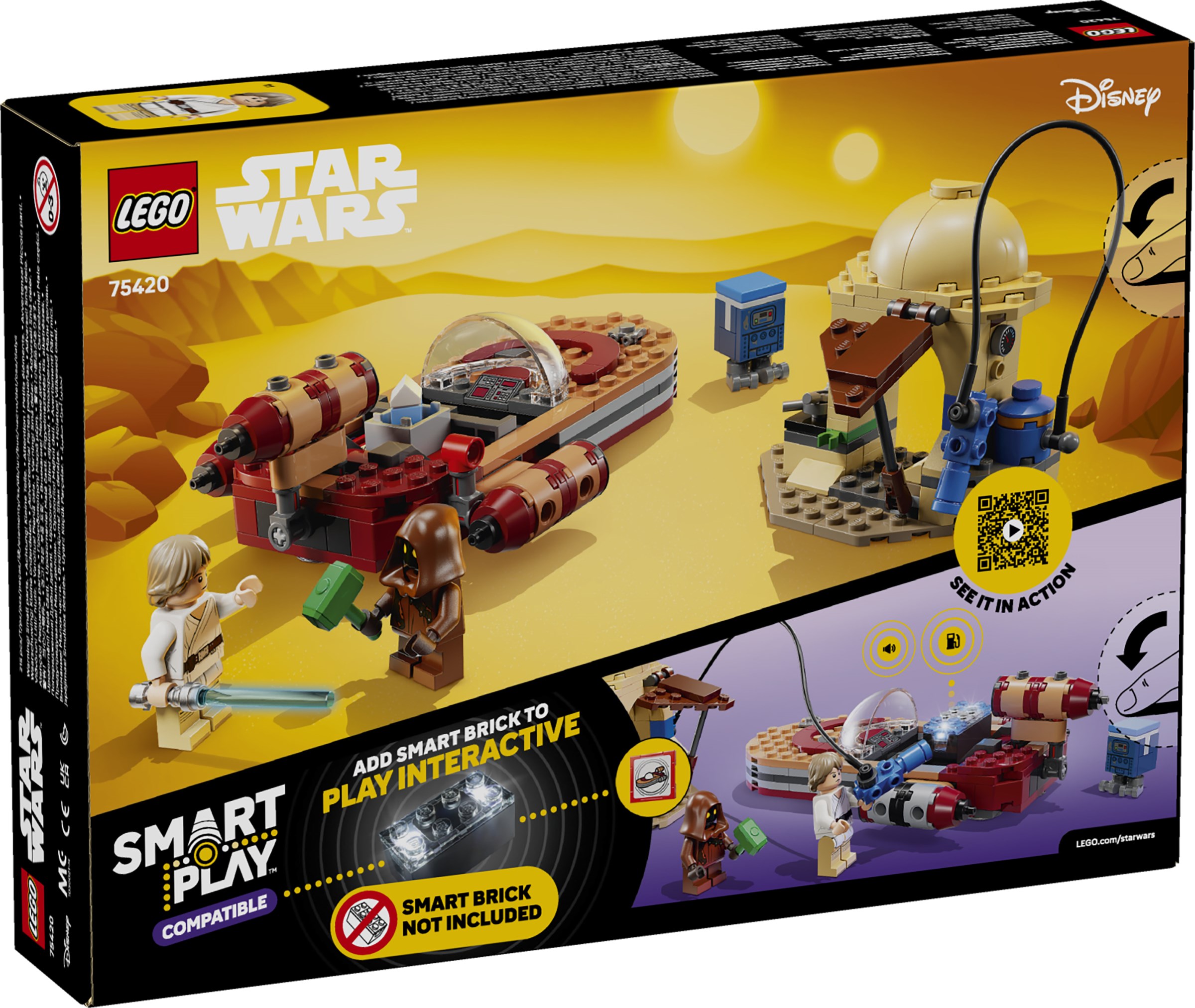 This LEGO SMART Play Compatible Set includes a SMART Luke Skywalker LEGO minifigure, a Jawa LEGO minifigure and a Gonk Droid, plus a SMART Tag. Add a SMART Brick from All-In-One Sets 75421, 75423 or 75427 (sold separately) for interactive play, bringing SMART Luke Skywalker to life and activating dynamic lights and sounds when fuelling, repairing and driving the Landspeeder.