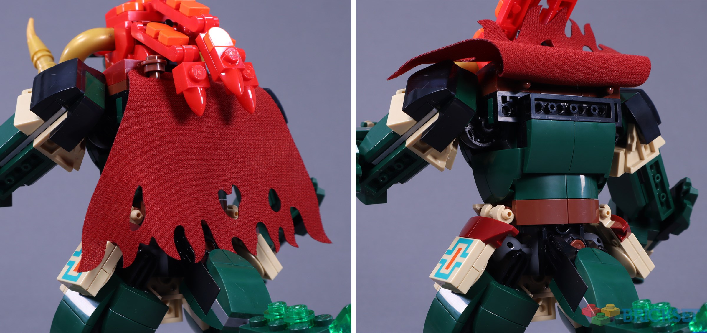 Not only is this bespoke cape beautiful and will surely be popular with many MOC builders, it also serves to cover up this awkward plate underside at the rear. This could definitely be worse, however, as the black anti-studs do blend in with the dark green ribs and waist.