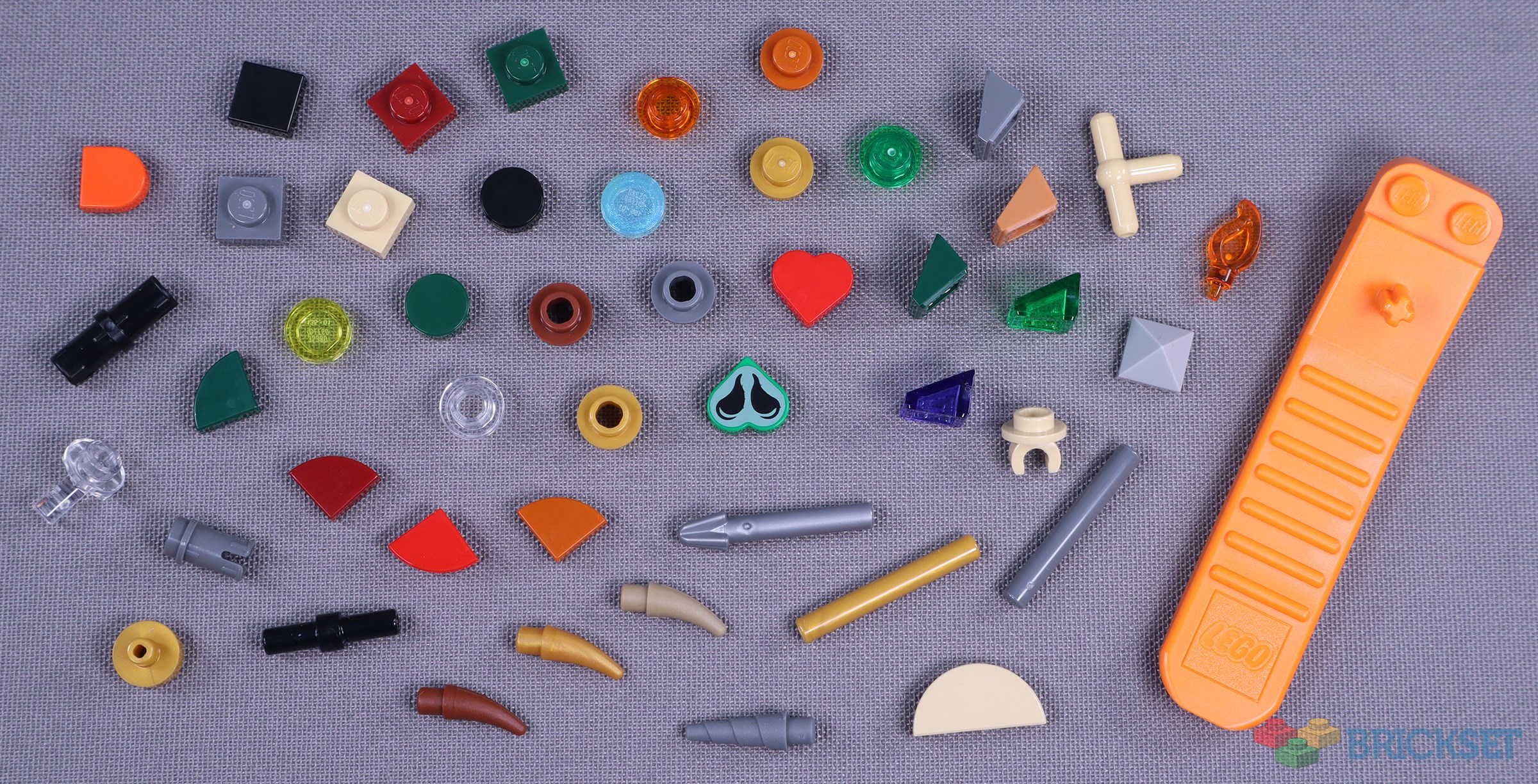 Among the spare parts are Ganon’s nose, an extra heart for an injured Link, and some interesting tan parts: the stud with clip below is less rare now that thirteen of them appeared in 21064 Paris - City of Love, but was still a treat to receive. The tan pneumatic T-bar is a favourite of mine, and this is the first time I’ve built with it outside of a Botanicals set.