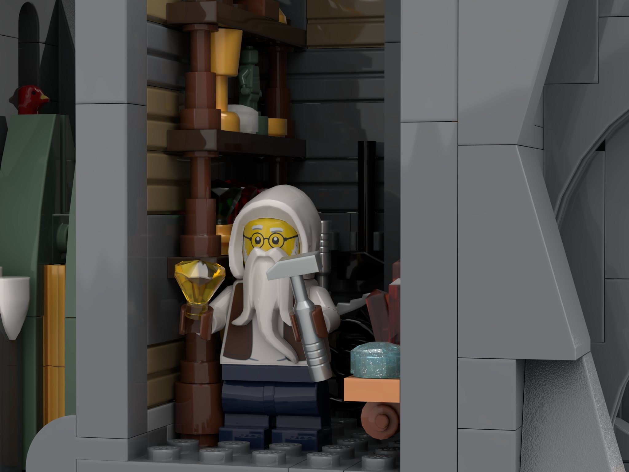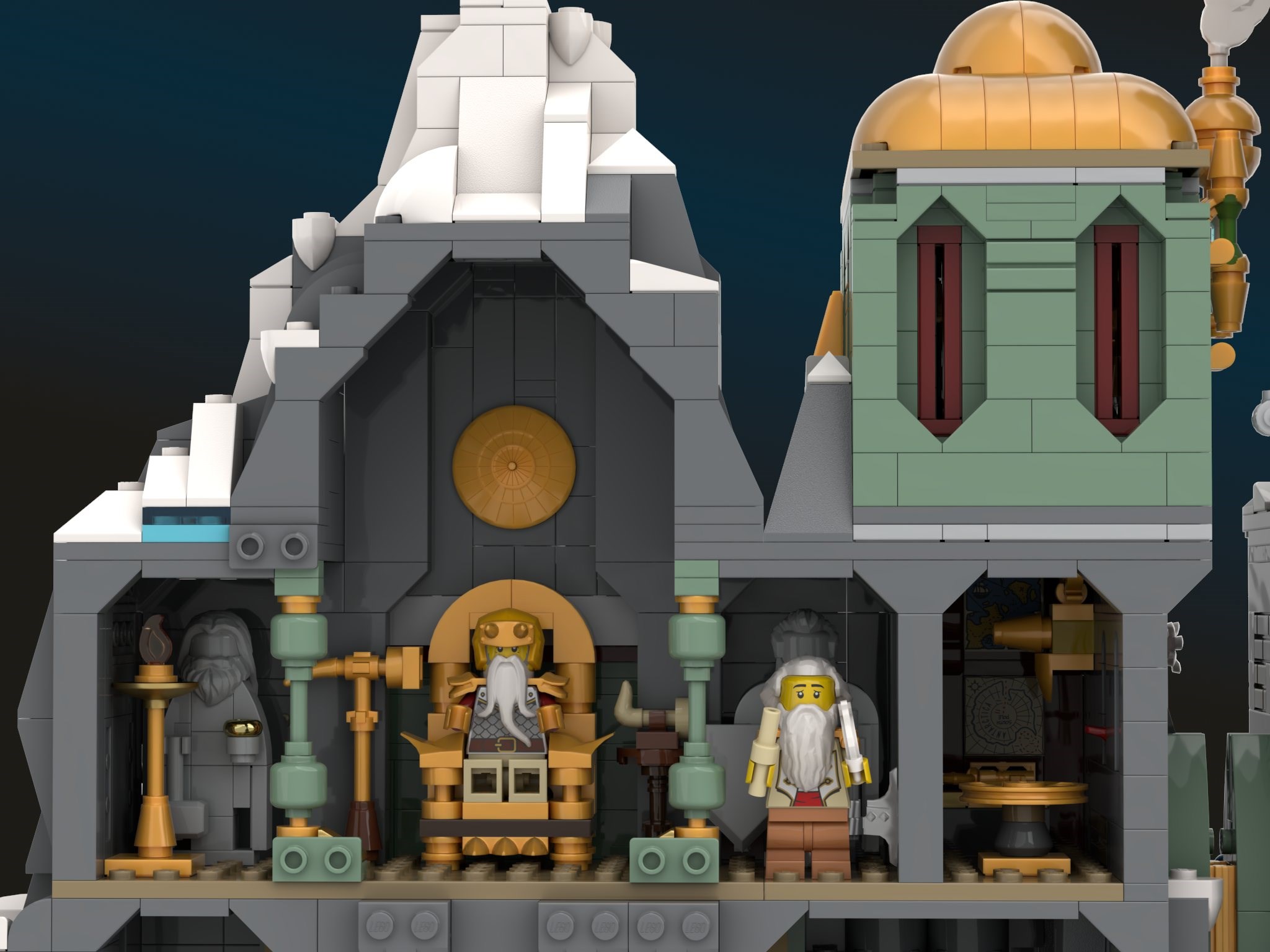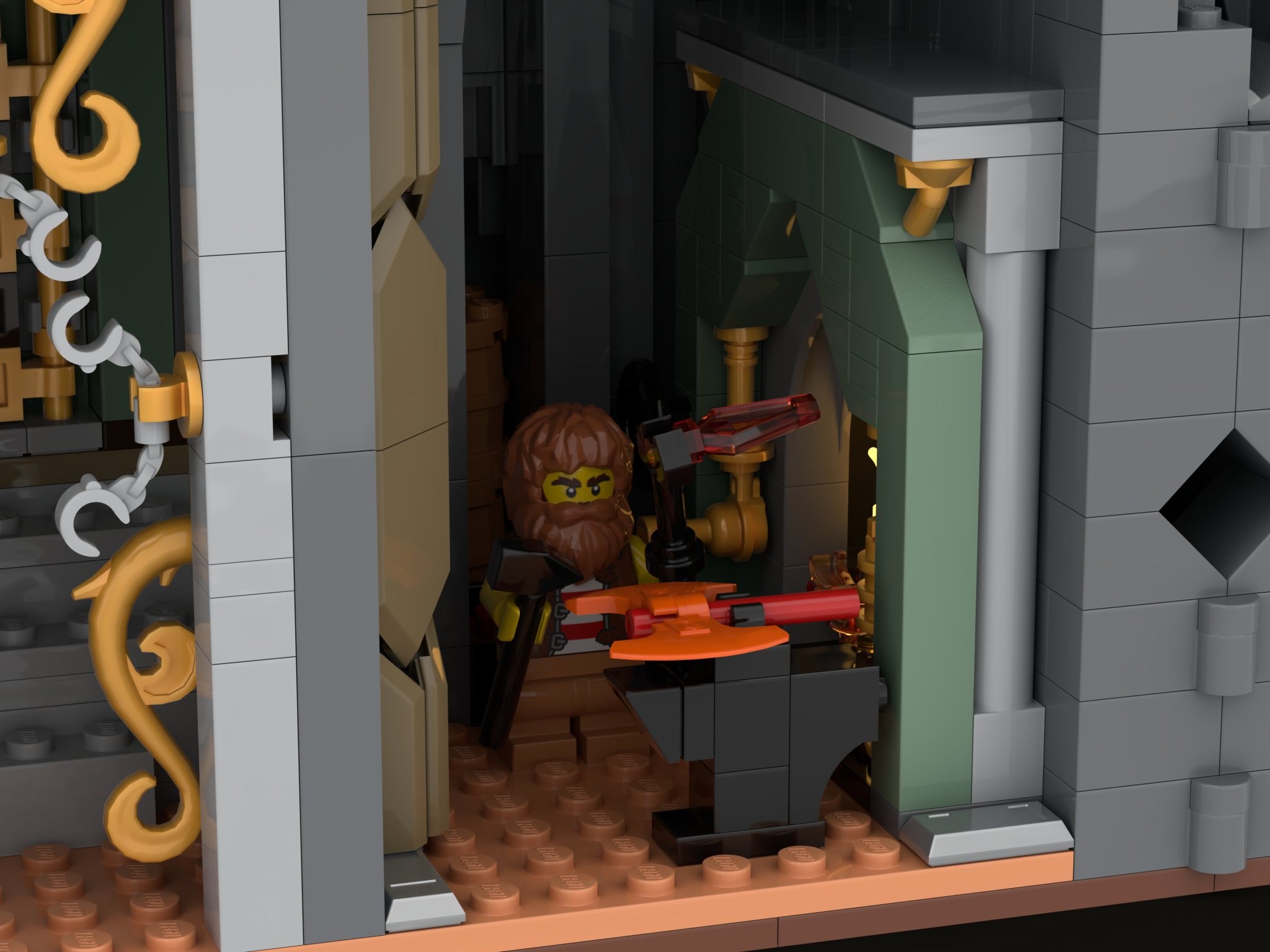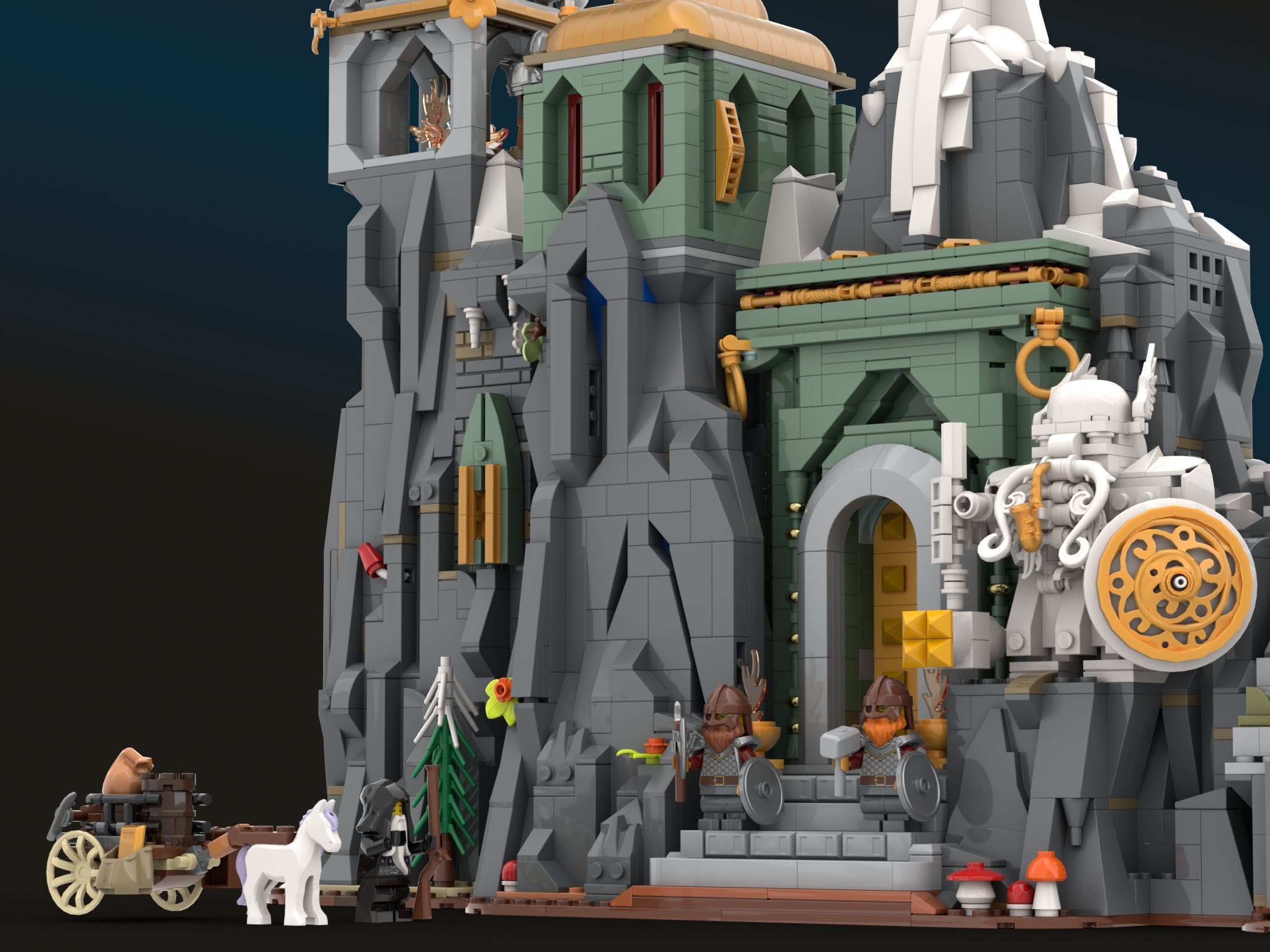 My inspirations come from various sources in high fantasy, from literature, movies, games and art, all blended together in my imagination. My most prominent influences are the works of J.R.R Tolkien, namely the Silmarillion and LotR. Some notable visual influences include the Doors of Durin and grand halls of Khazad Dum from Peter Jackson’s LotR trilogy, Tolkien’s own illustrations, and the art of Alan Lee, Ted Nasmith and John Howe. Art and design from Markarth and Dwemer Ruins from the Elder Scrolls games has also influenced me, as well as Ironforge from WoW, the animated Hobbit film from 1977, dozens of brilliant LEGO builds (both official sets and AFOL builds), art from early editions of MTG, namely Mark Poole’s Dwarven Ruins, and numerous other sources. This has all cooked in my mind as I’ve tried to synthesize something new and original, and fit it into the BDP design prompt with limited part count and a pre-determined palette. The goal of this build was to create an authentic and grand Dwarven Realm that many fans could add to their collection.