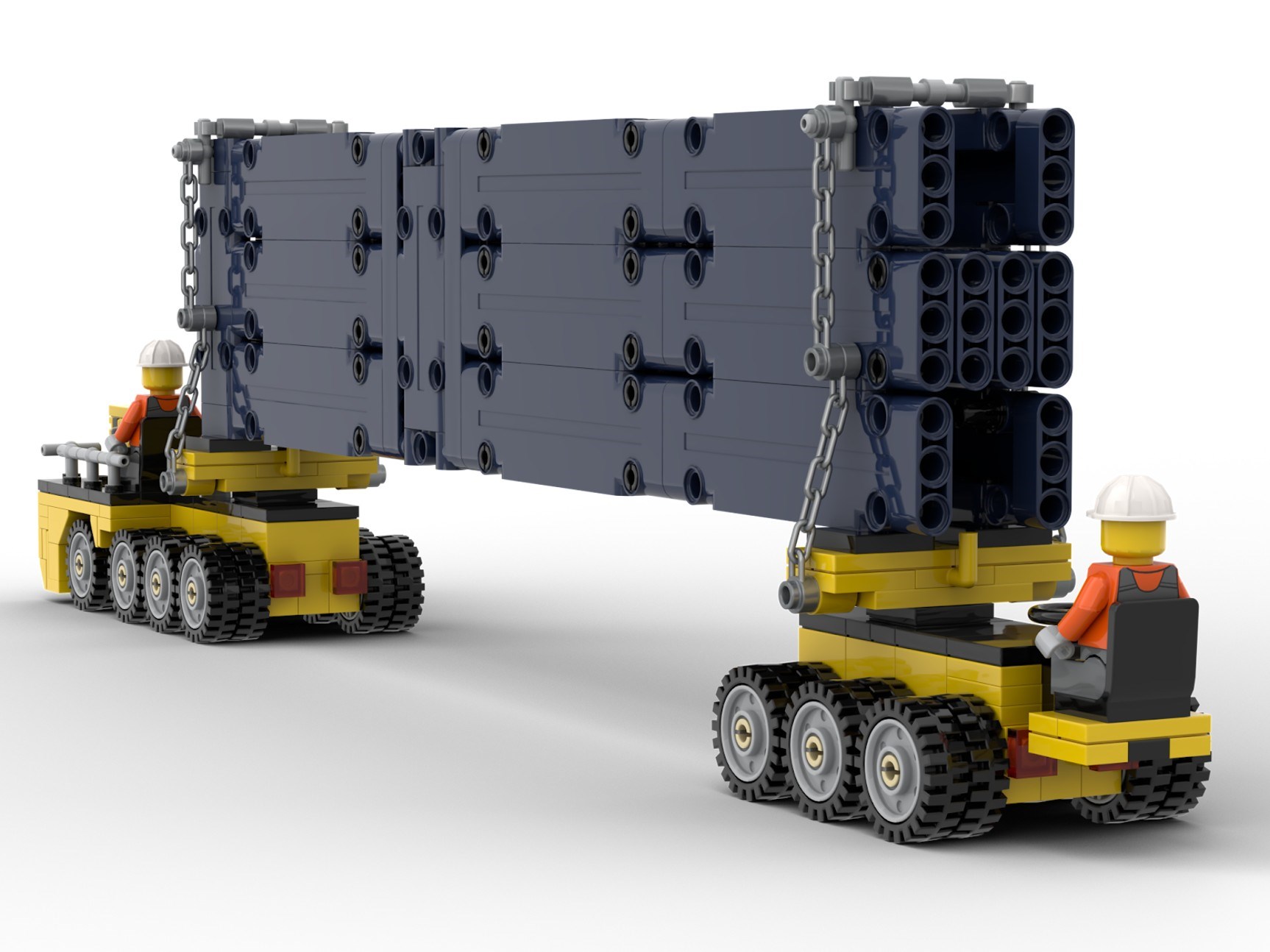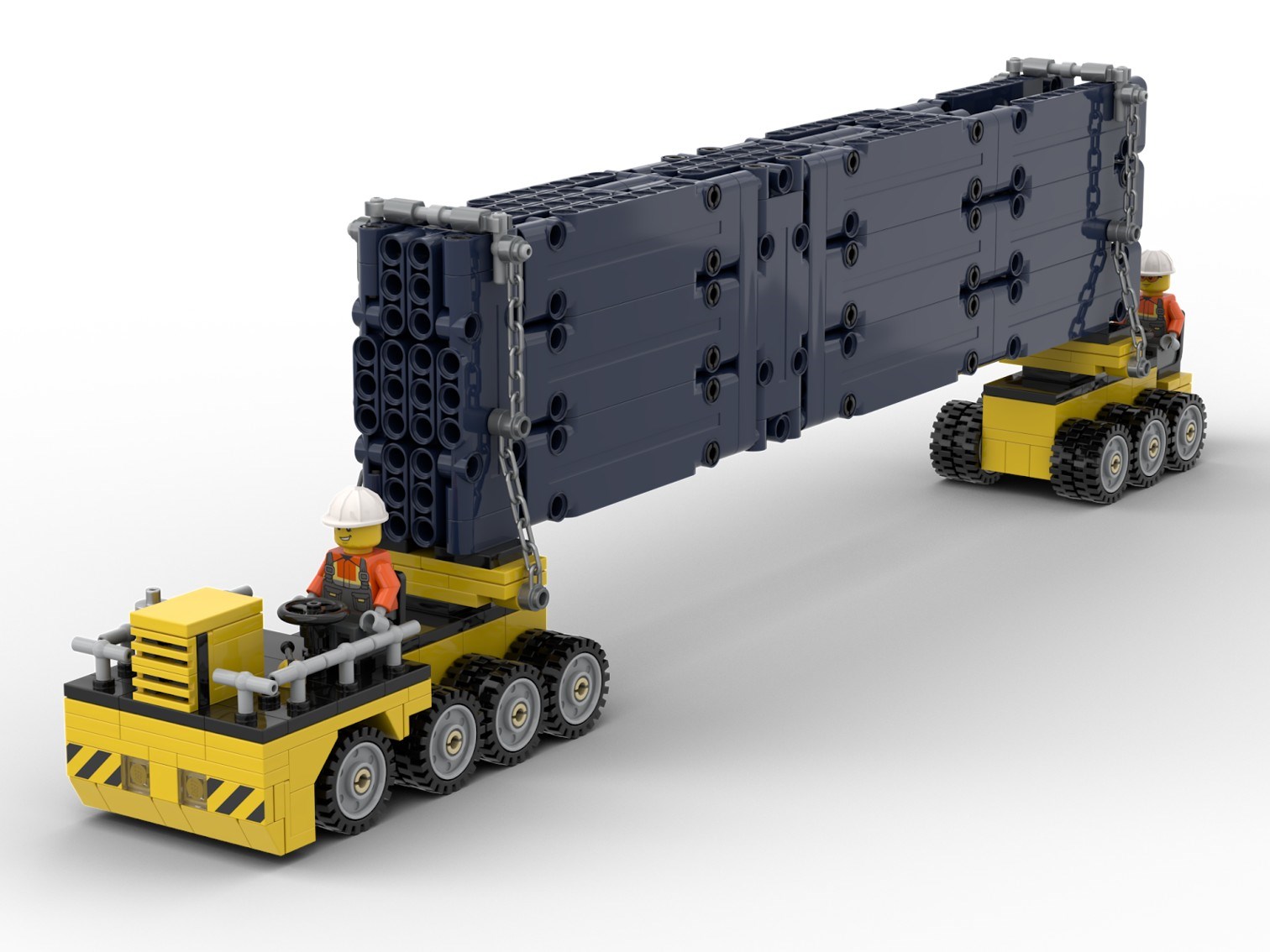 To give the extra girders a home, I decided to make them cargo for a vehicle to go with the set. Having a vehicle for the bridge would be great anyway! I needed something I could build to the deluxe level people expect from BDP models, but limit the piece count. In researching girder transporters, I found that some of them are actually two flat vehicles placed on opposite ends of a huge girder. That was just what I needed!