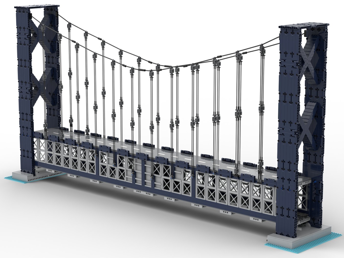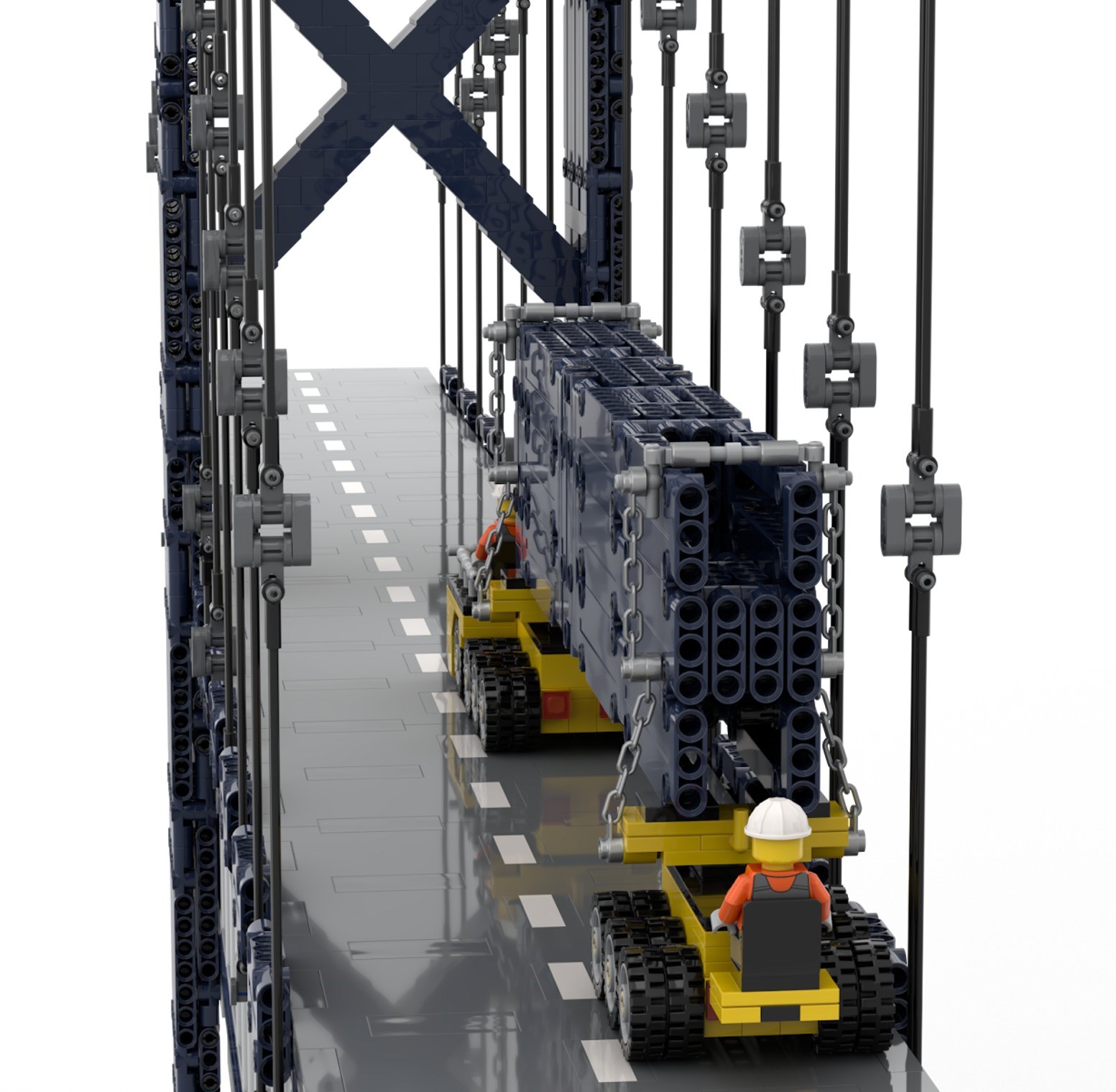 My main goal was to recreate the bridge as it is seen in the picture. That means 4 X-shaped beams (2 below the road and 2 above), and 6 main cables on both ends. Obviously this picture only shows a part of a bridge, but I wanted to at least start with that and see where the piece count was before adding anything beyond the picture.