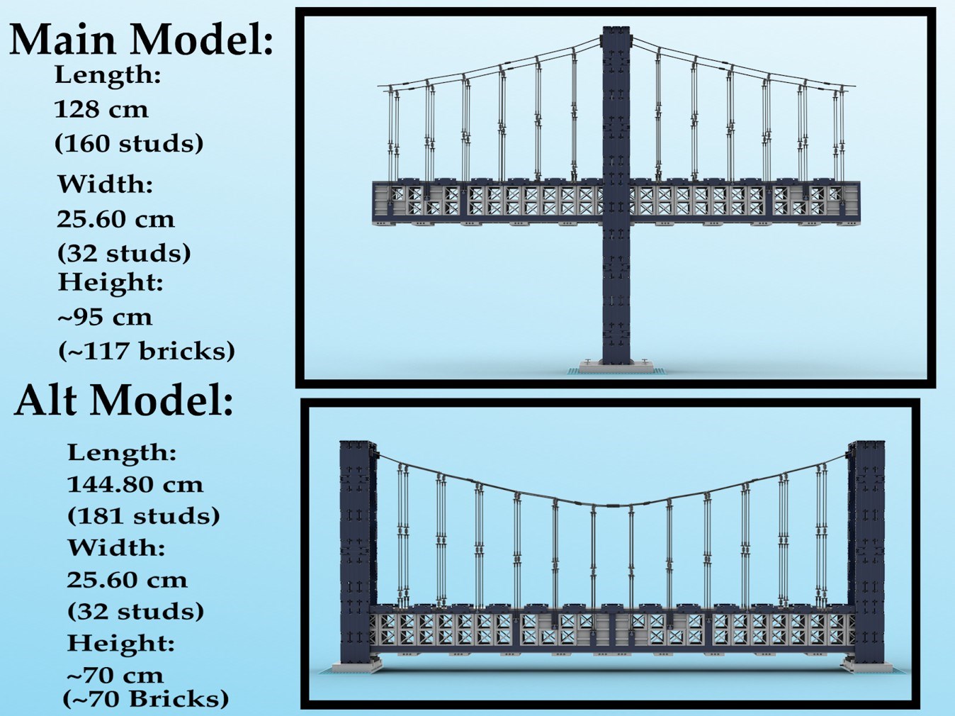 The final design is a sight to behold! Both bridge models are 32 studs in width. The main model is 160 studs long, or 5 32x32 baseplates long (5 modular buildings), and about 117 bricks tall! If it were an official model, it would be the 6th tallest Lego set, and the 2nd longest Lego set! The alternative model is shorter at about 70 bricks tall, but longer at 181 studs, which would break the record for the longest Lego set!