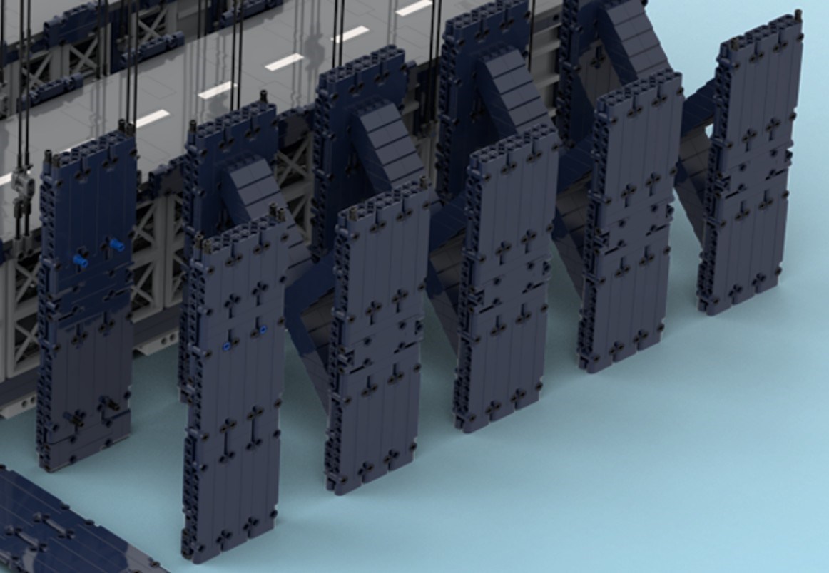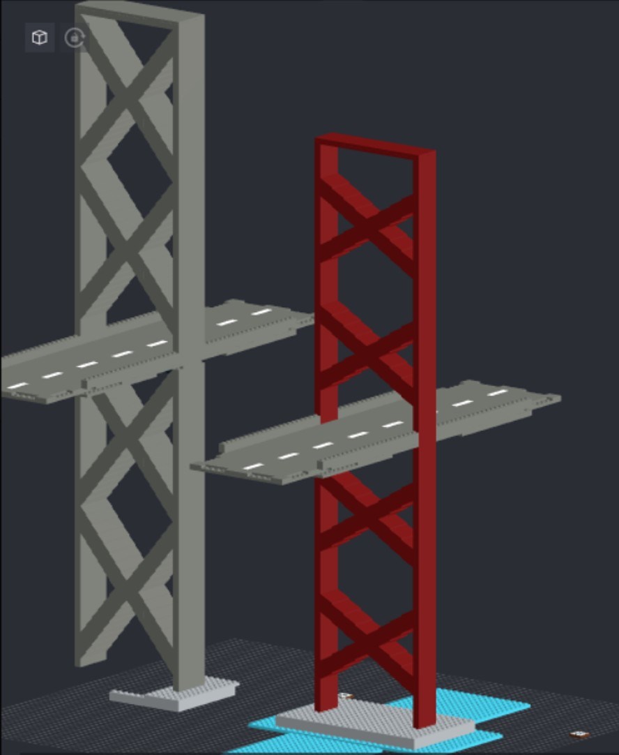 There was only one problem: A second pylon would also require a second base, top, and side beams (the beams that connect to the side of the road/tunnel portion of the bridge). I did not want to include a bunch of pieces that would increase the cost if they weren't even going in the main model of the set. But I had an idea of how to put those extra pieces to good use!
