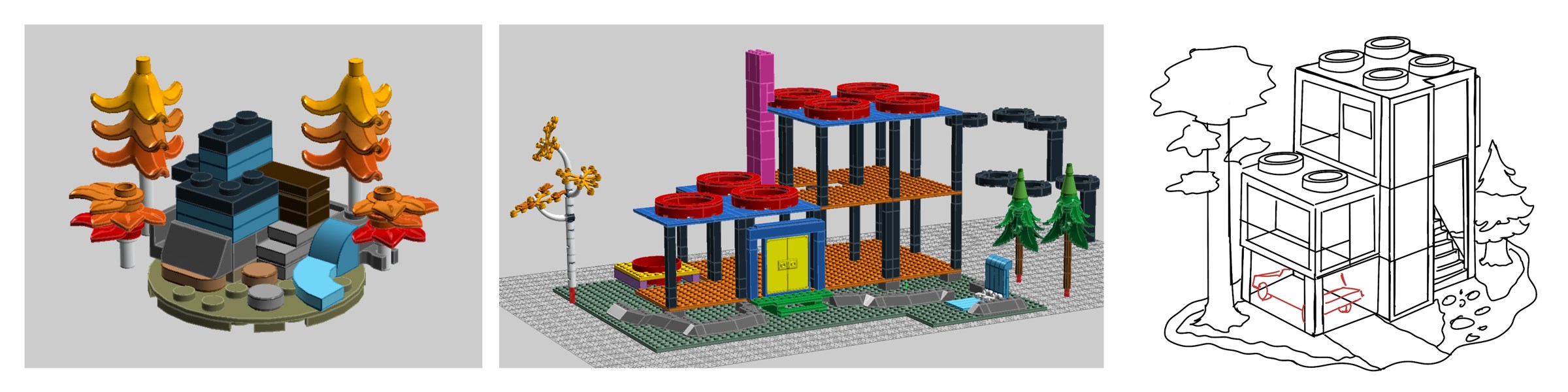 During a quick build burst, I mocked up a little 6x6 diorama of what I thought the final model could resemble. Another day, I whipped up a rough two-story mockup as another idea. Throughout the process, I explored integrating bits of nature such as rockwork and a stream, but ultimately could not justify elevating the space without wasting the interior of those builds. I iterated on two story homes, settled on three, and tried to add some dimension by adjusting the heights and depths of different rooms, much like real contemporary homes.