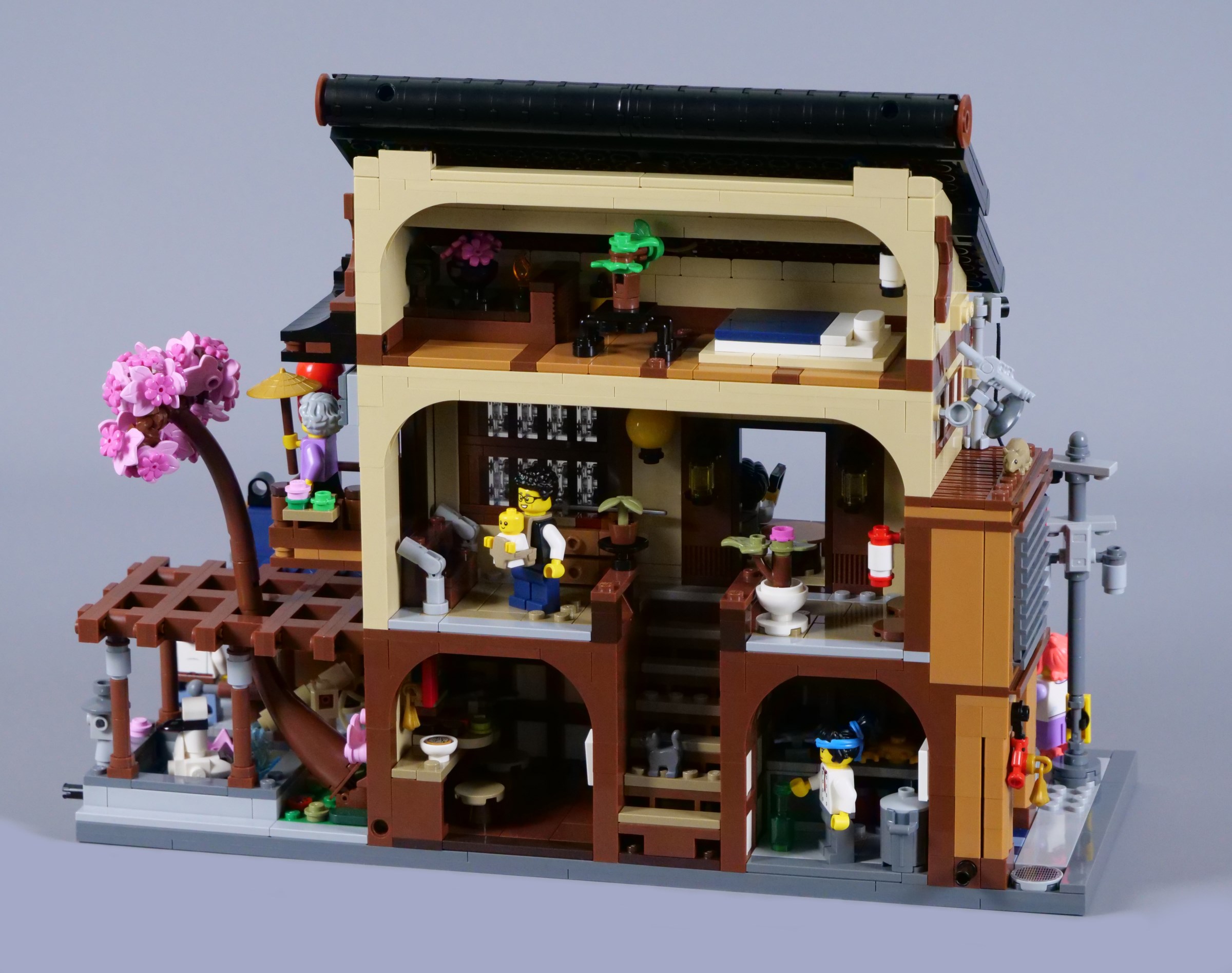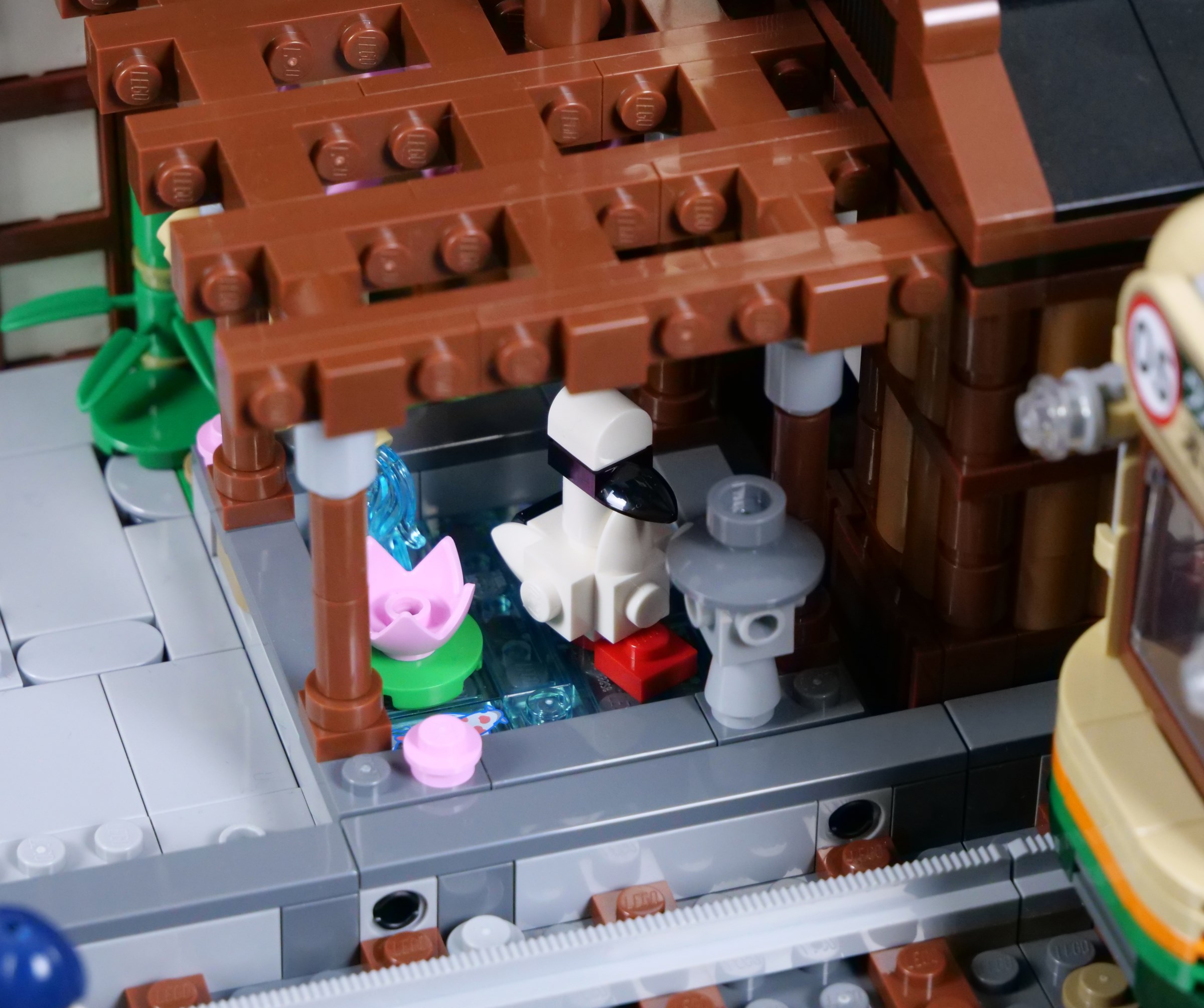 I love the peaceful garden area hidden behind the cart, containing a koi pond with a traditional bamboo water spout. Printed koi carp 1x2 tiles are used in the pond, with a red-crowned crane sitting on the water. The brick-built pergola looks excellent as well, especially with a pink-leafed tree growing through.
