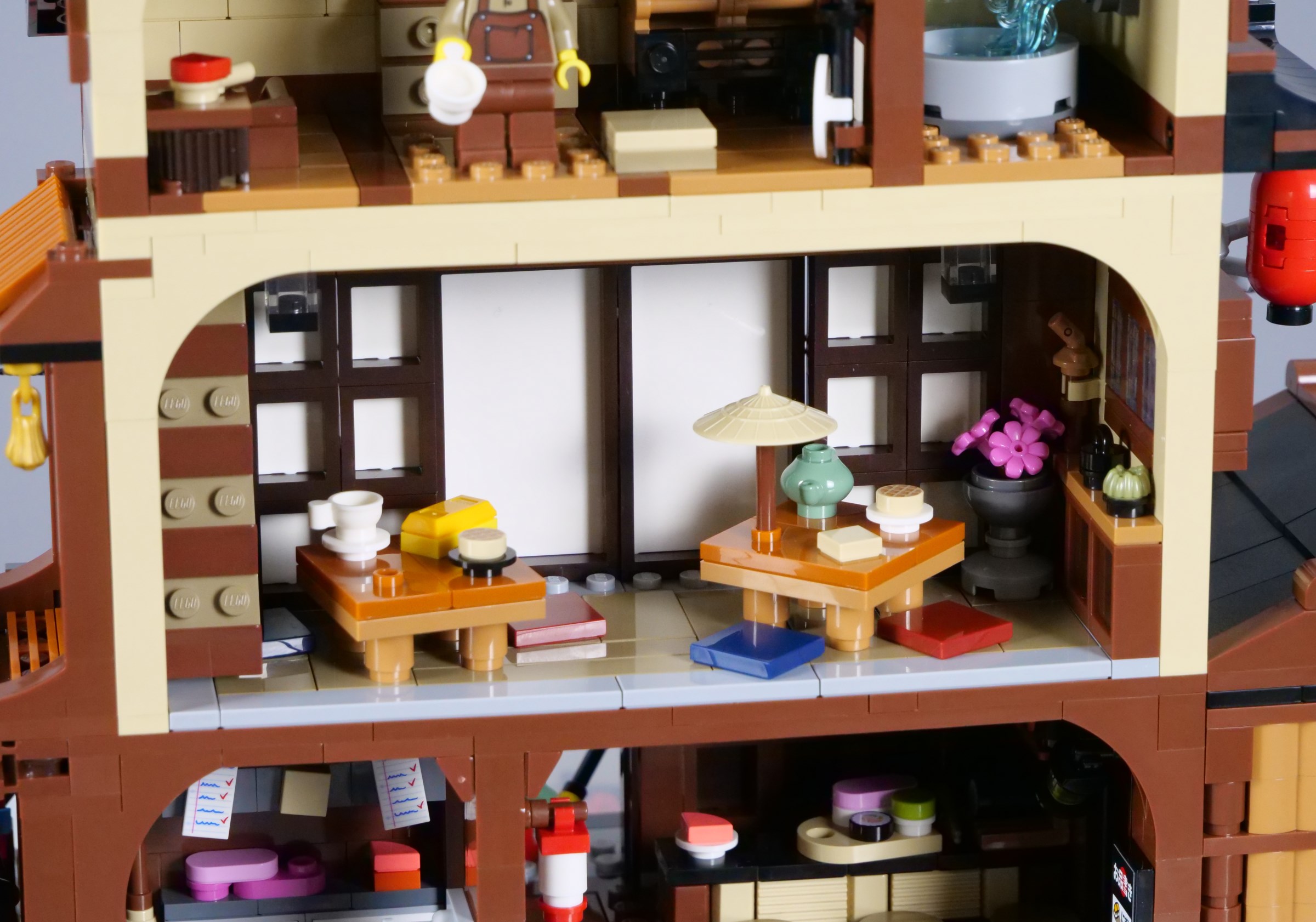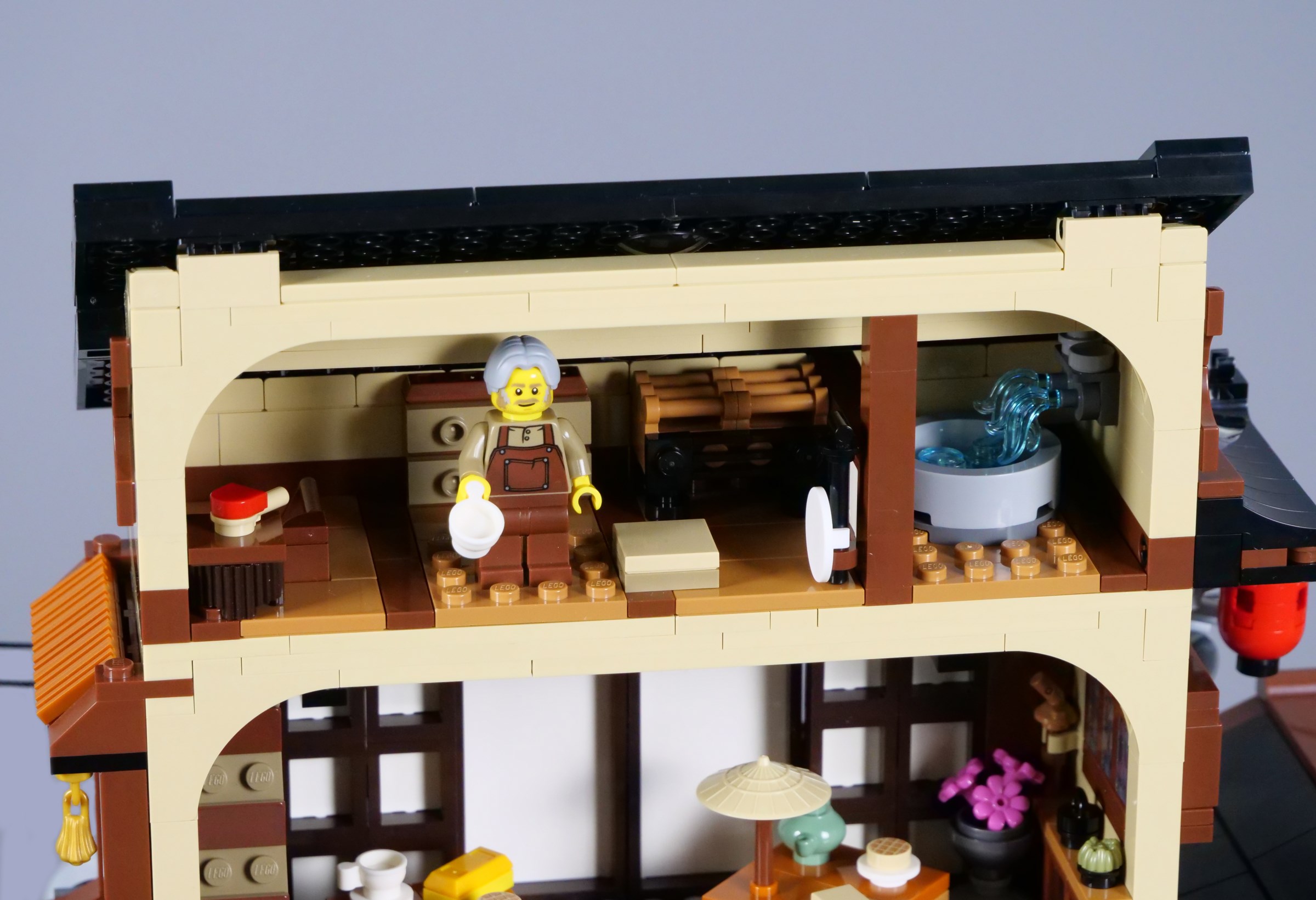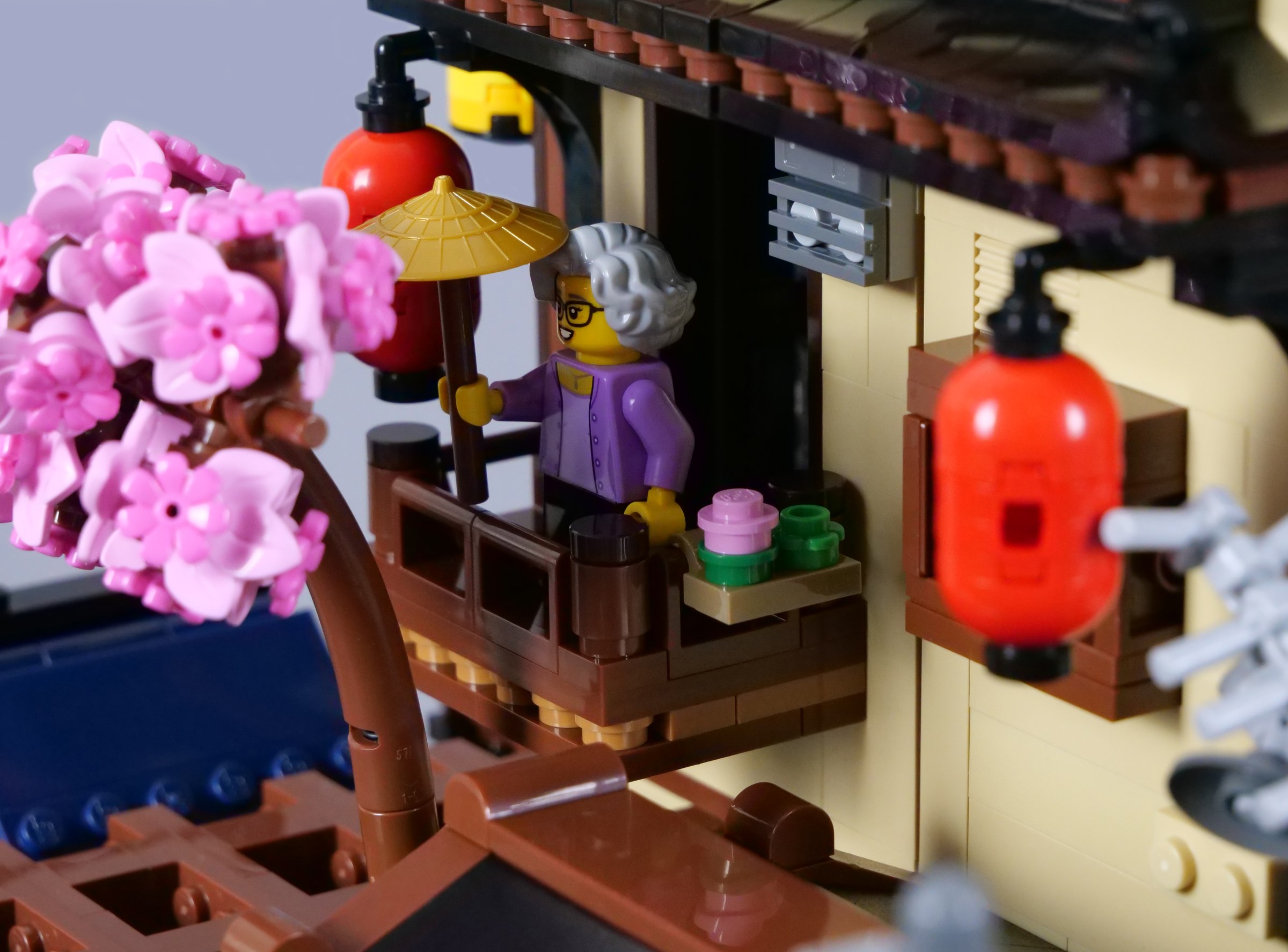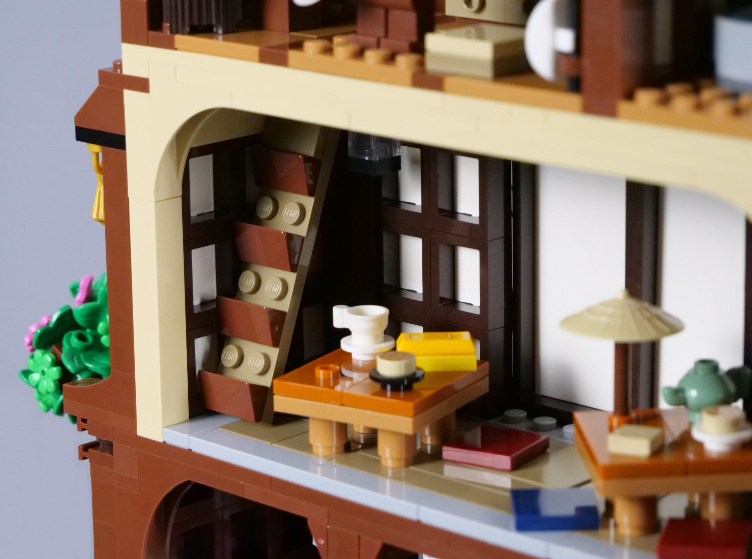 The balcony is decorated with additional lanterns and flags, with ample space for minifigures to stand outside the tearoom. The stickered doors look superb, although I have found they have a tendency to get stuck as they slide, conflicting slightly with the window frames that comprise the walls.