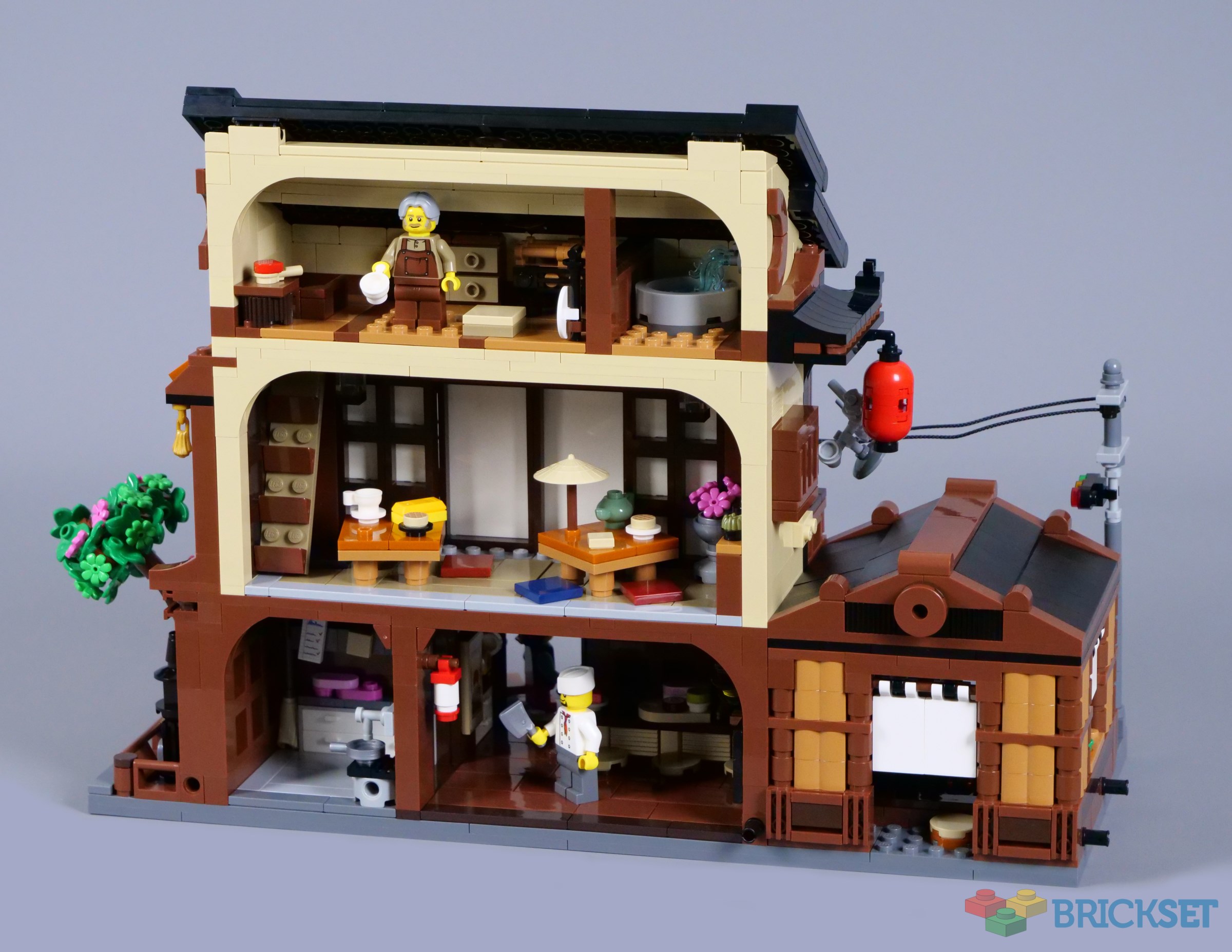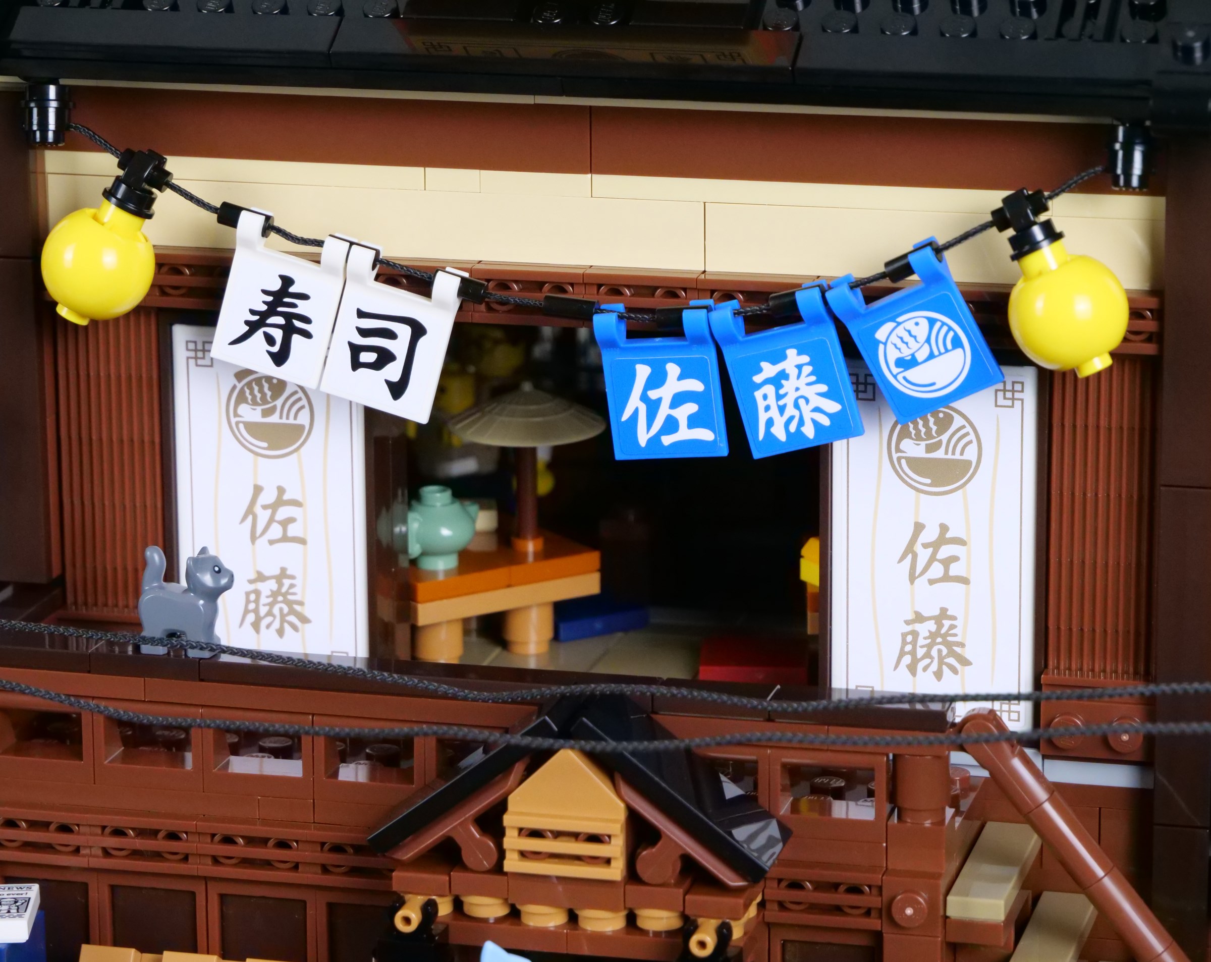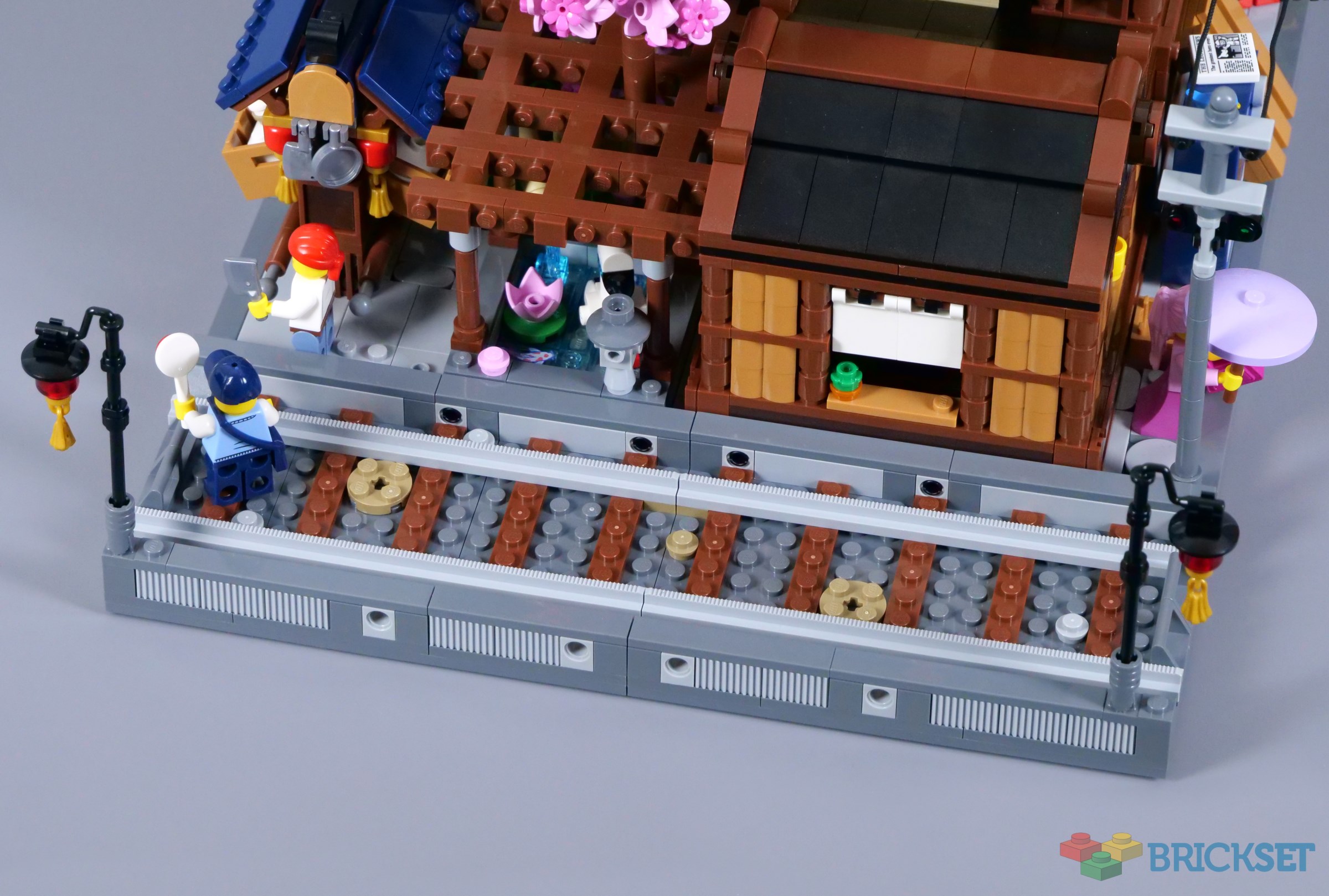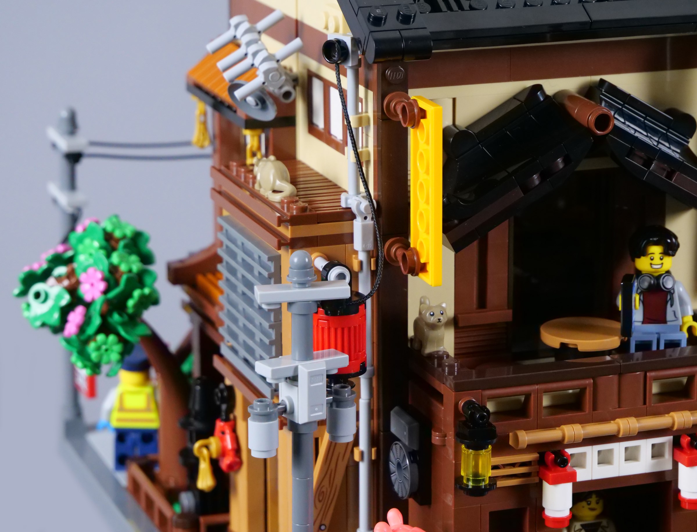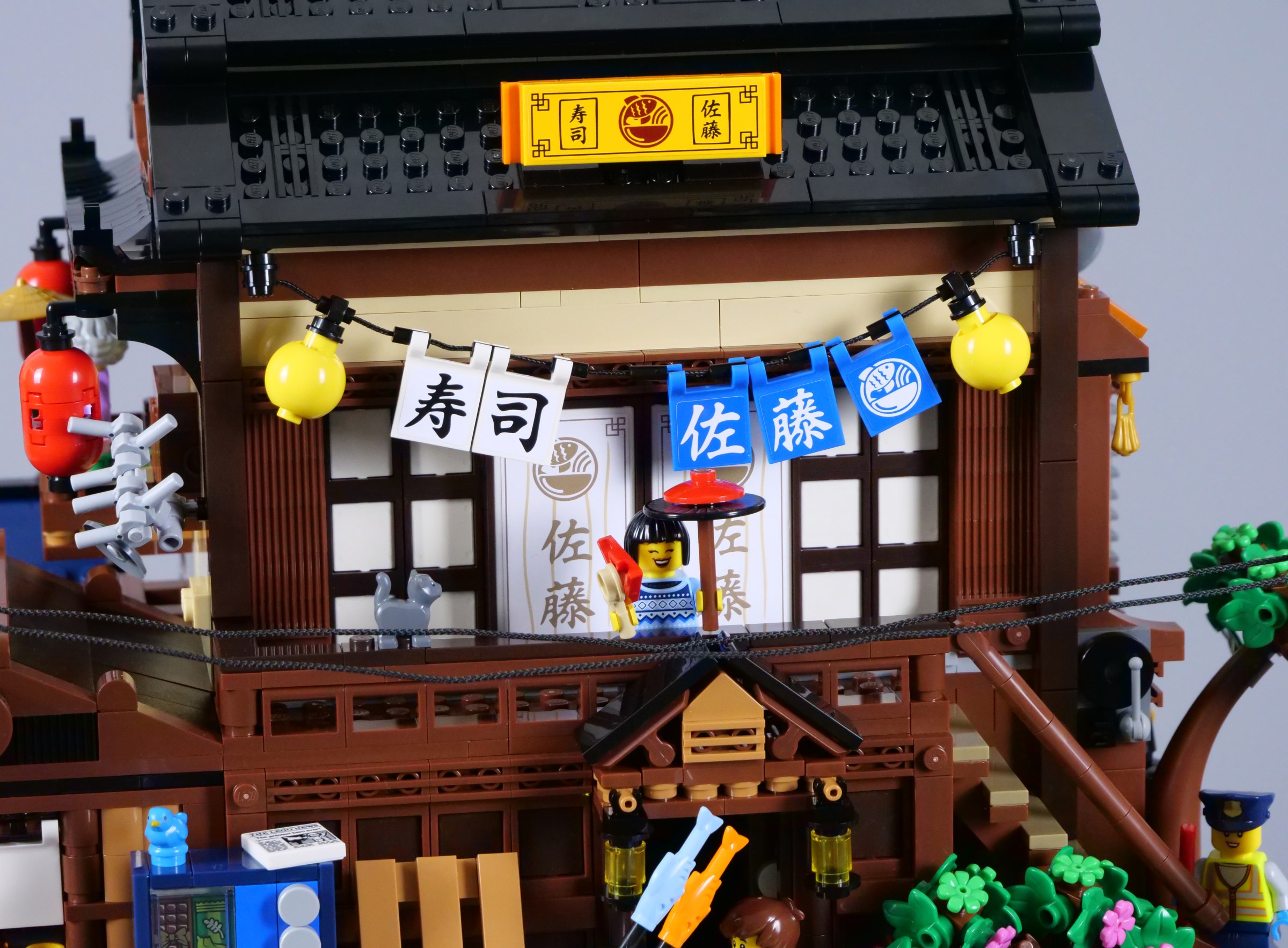 The balcony is decorated with additional lanterns and flags, with ample space for minifigures to stand outside the tearoom. The stickered doors look superb, although I have found they have a tendency to get stuck as they slide, conflicting slightly with the window frames that comprise the walls.