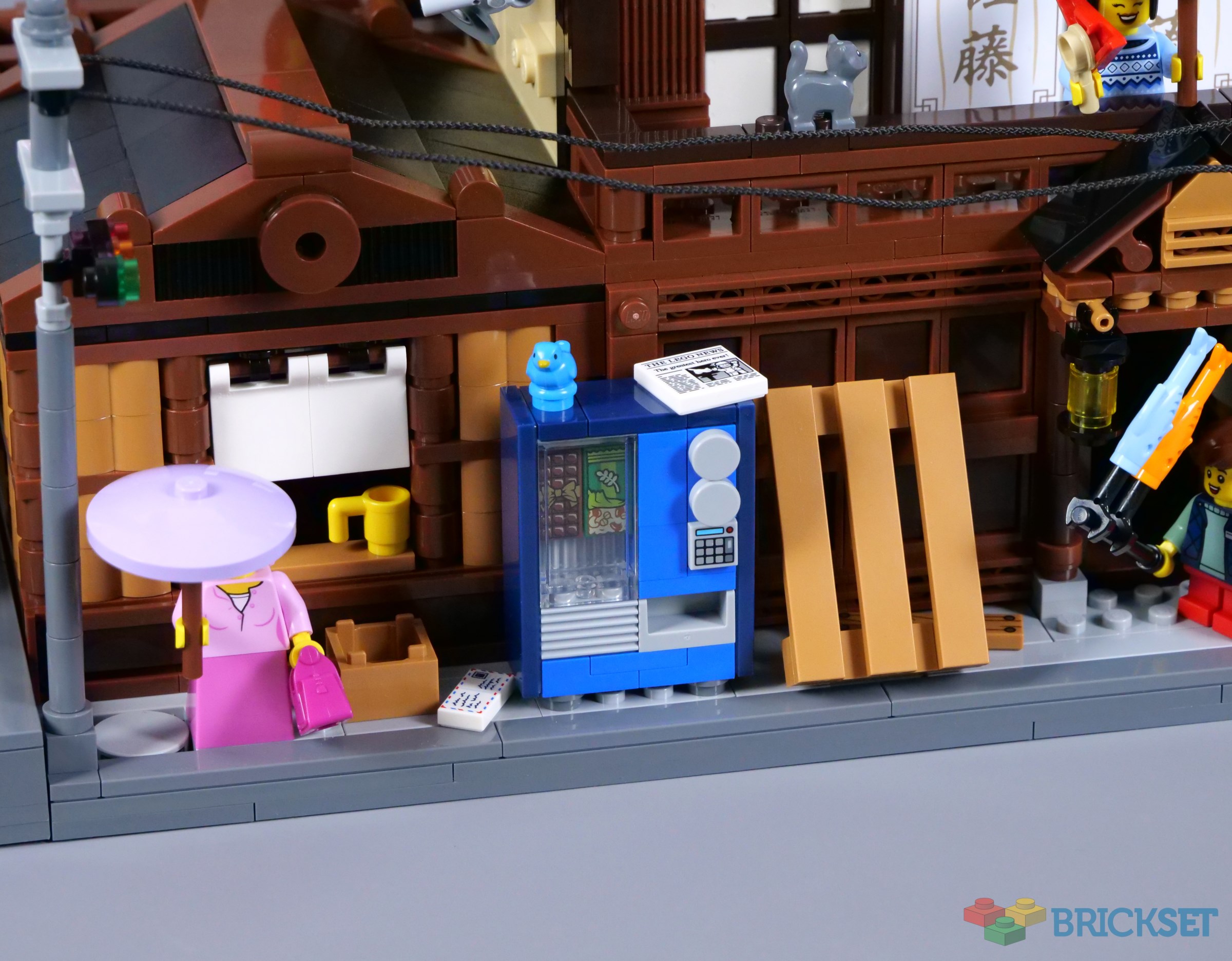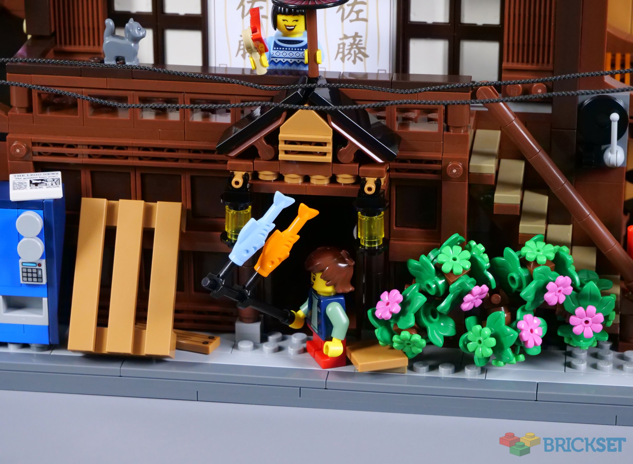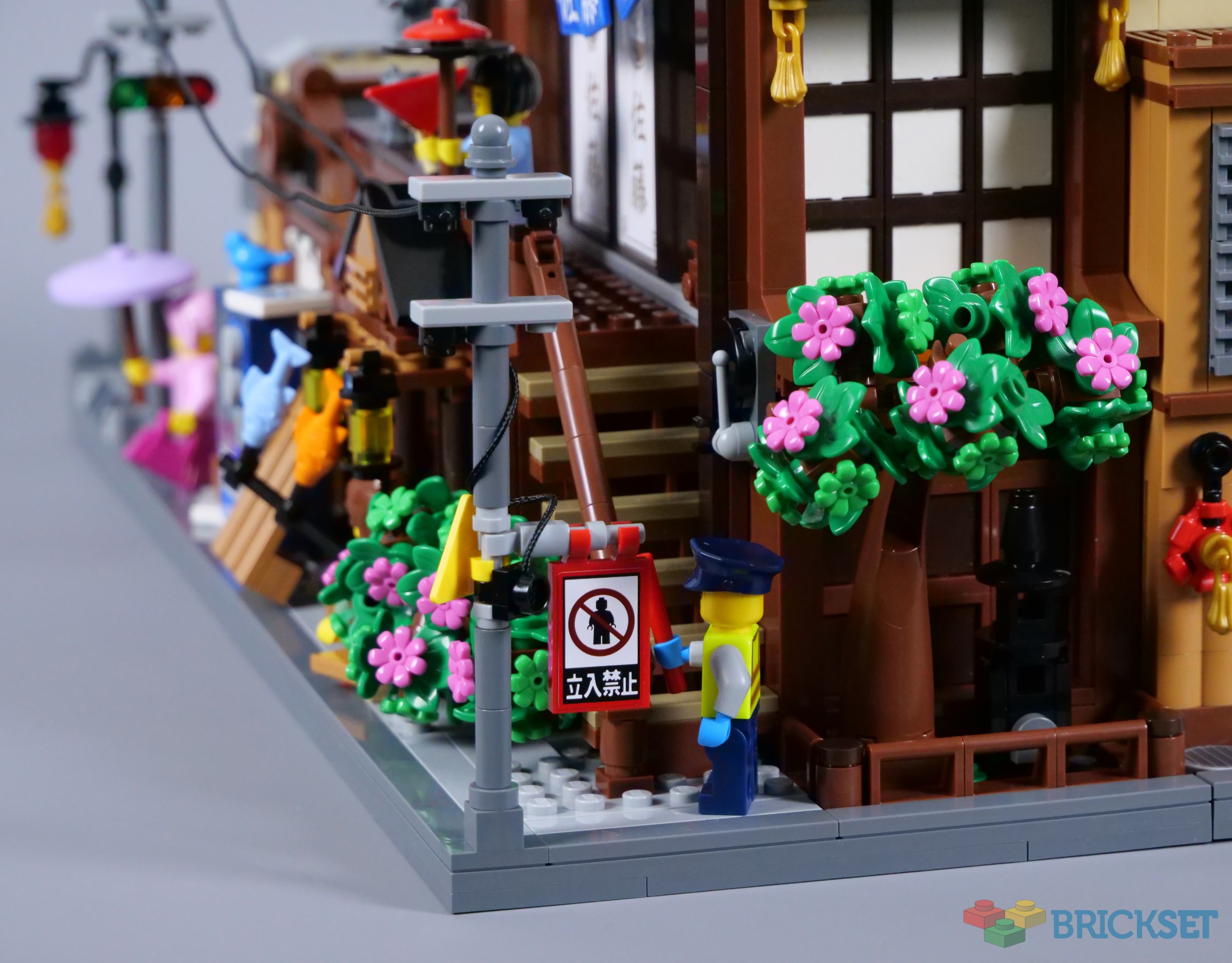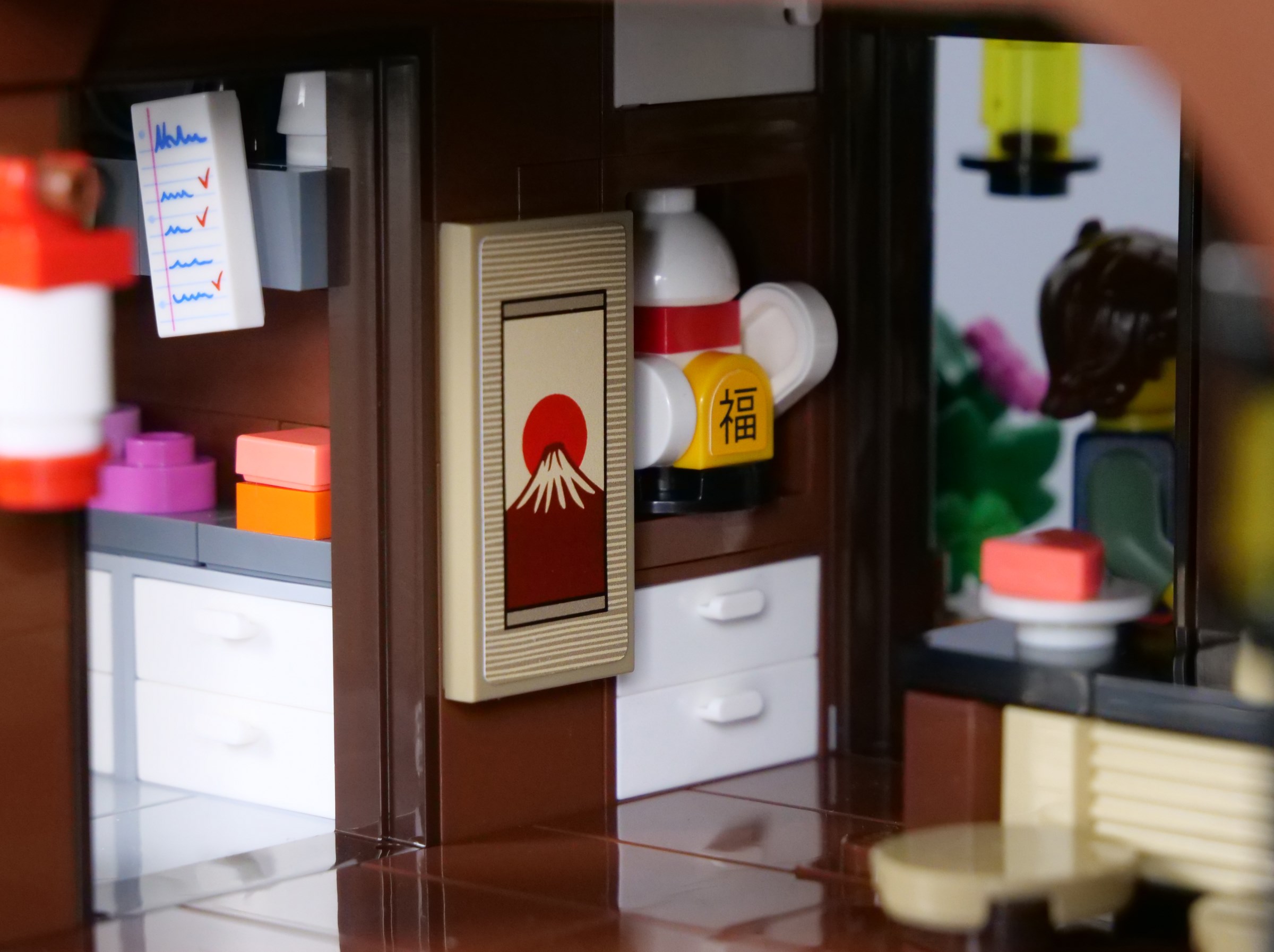 The balcony is decorated with additional lanterns and flags, with ample space for minifigures to stand outside the tearoom. The stickered doors look superb, although I have found they have a tendency to get stuck as they slide, conflicting slightly with the window frames that comprise the walls.