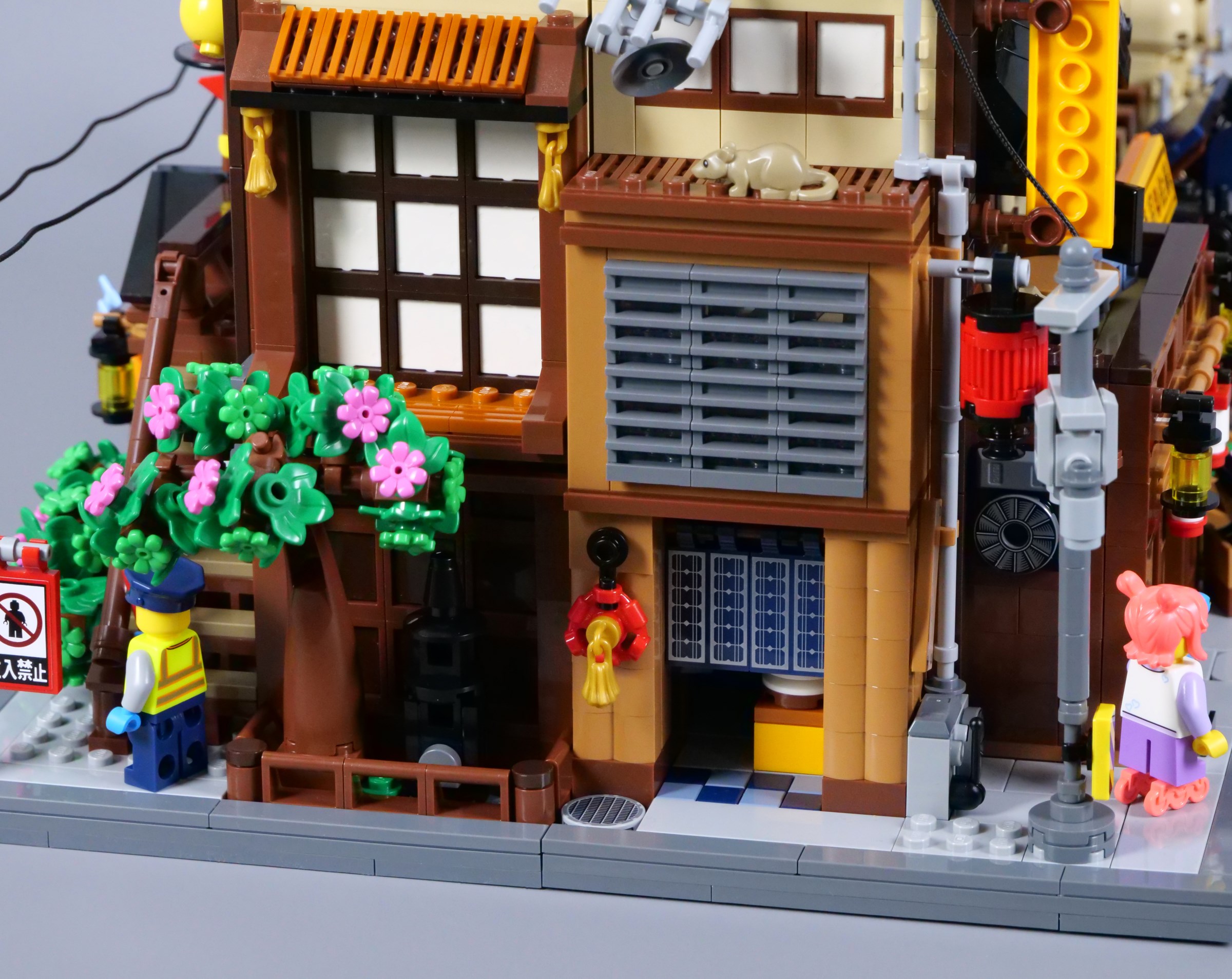 The electrical pole is an interesting detail, hardly ever seen in standard sets. The cable actually follows quite a sensible route, going from the pole to a pipe attached to the building, which then leads down to a junction box at ground level. Ornate architectural details are lovely, but features like this are what really distinguishes the Sushi Restaurant from other sets.