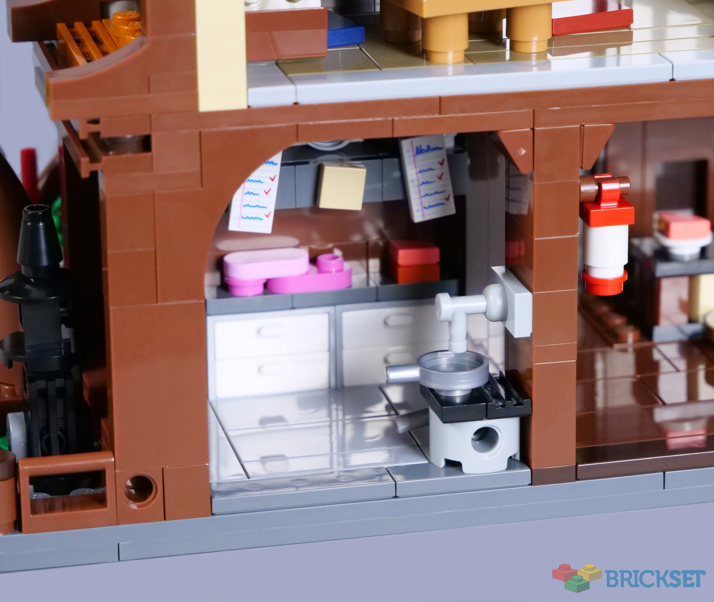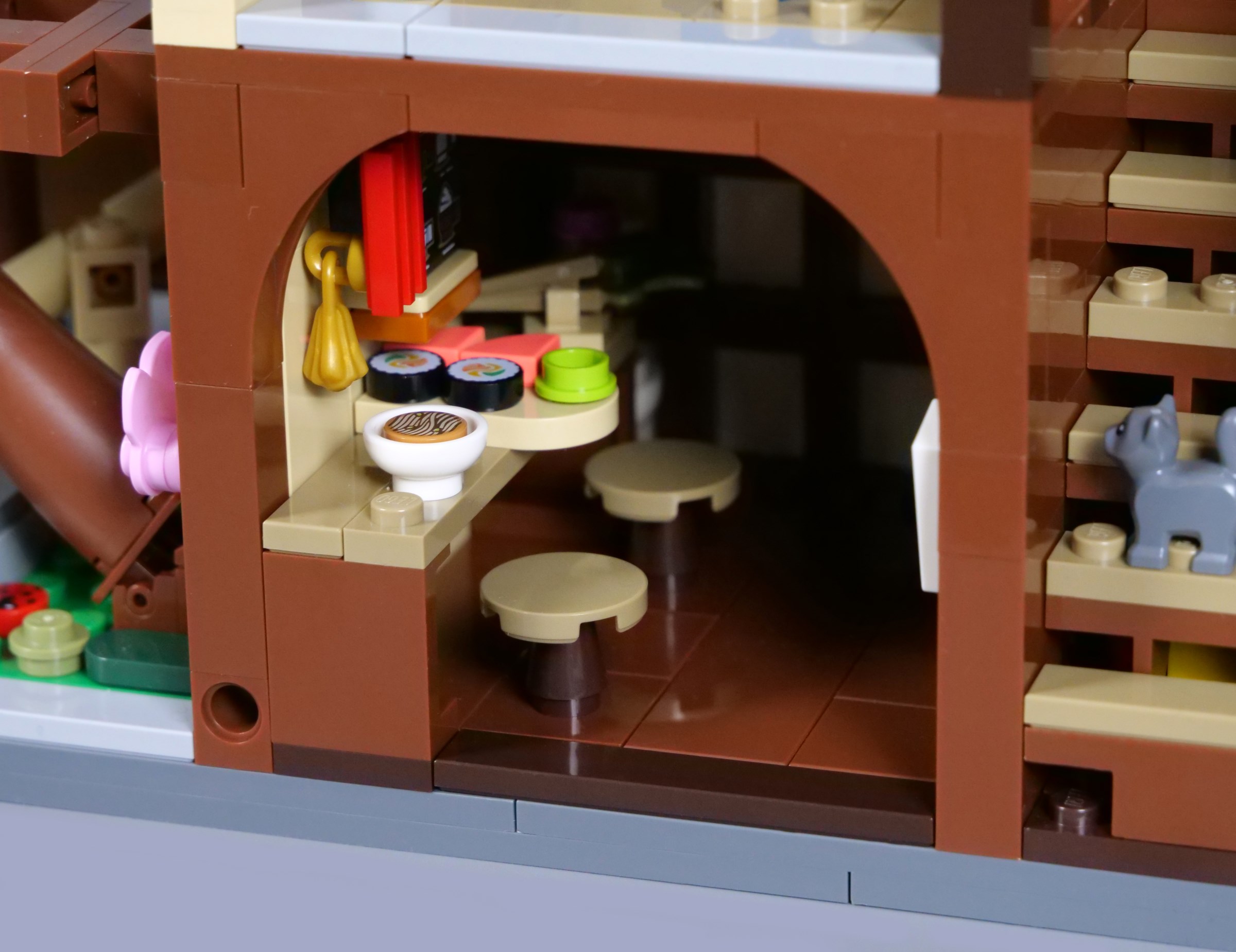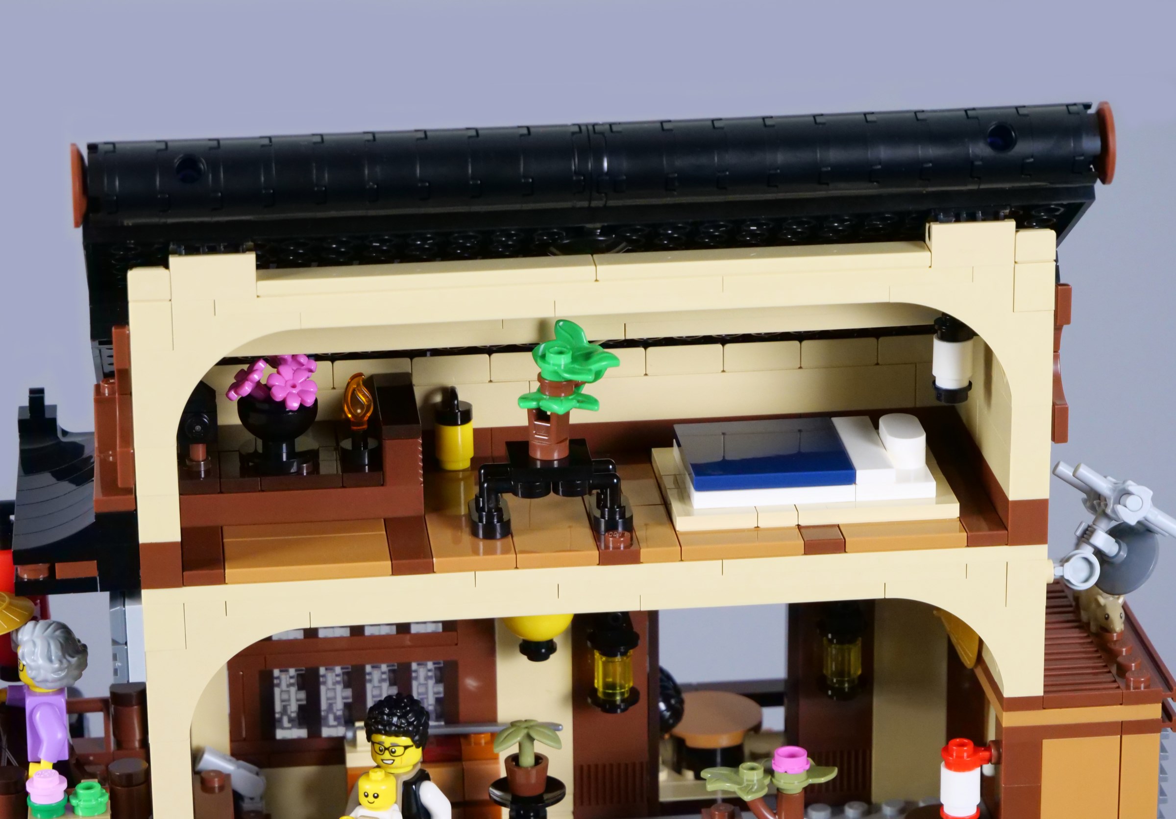 Suddenly, the aforementioned tearoom is easily recognisable, with two dining tables and lots of vibrant cushions scattered on the floor. Space is quite limited, but I appreciate the inclusion of a ladder to access the living room, so minifigures can navigate the whole restaurant building.