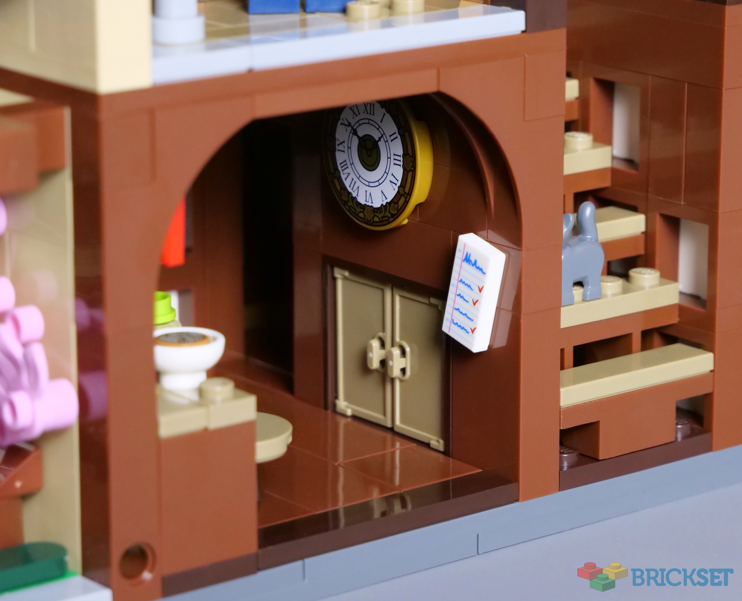I was surprised to learn that the building does not open on hinges, but separates into sections connected with Technic pins. That works well enough, although I would prefer hinges because the interior feels more cohesive when the building remains together, whereas this design really divides the rooms in half. Nevertheless, this arrangement allows ready access.