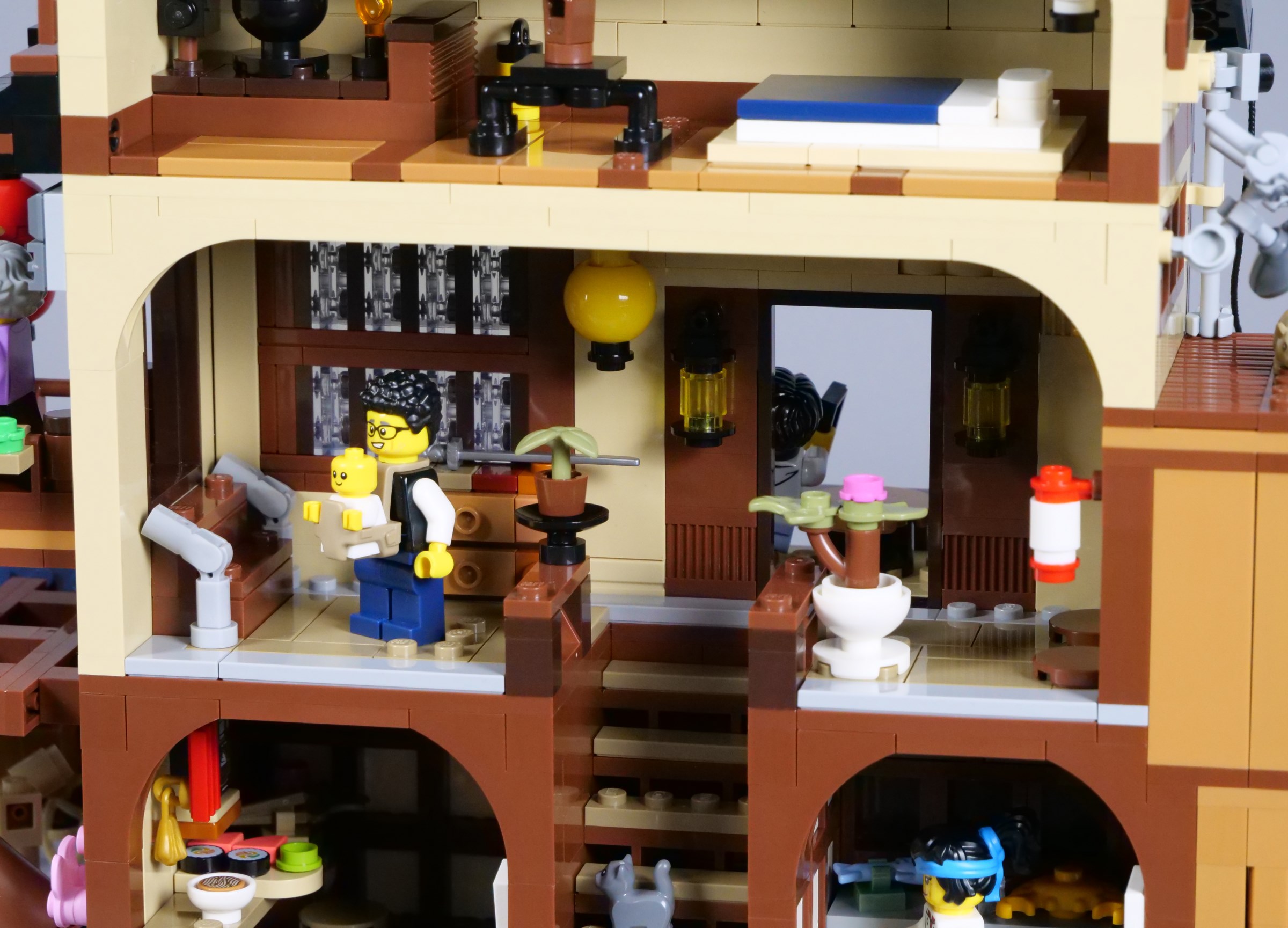 All the rooms match perfectly from one section of the model to the other, although seeing them divided highlights the advantages of the Modular Building format. For example, the stool on the top floor is intended for a minifigure to sit beside the bonsai tree, although the tree and the stool are awkwardly separated between the two halves.
