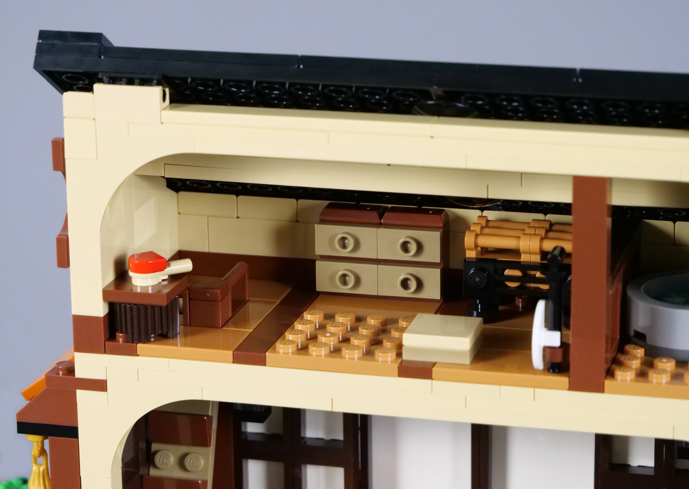 Though this is not a Modular Building, constructed on standard plates rather than a baseplate and lacking Technic pin holes in exactly the right locations, its size is very similar to a Modular Building. In this configuration, the model measures 40cm across and 26cm deep, which allows ample opportunity for intricate detail.