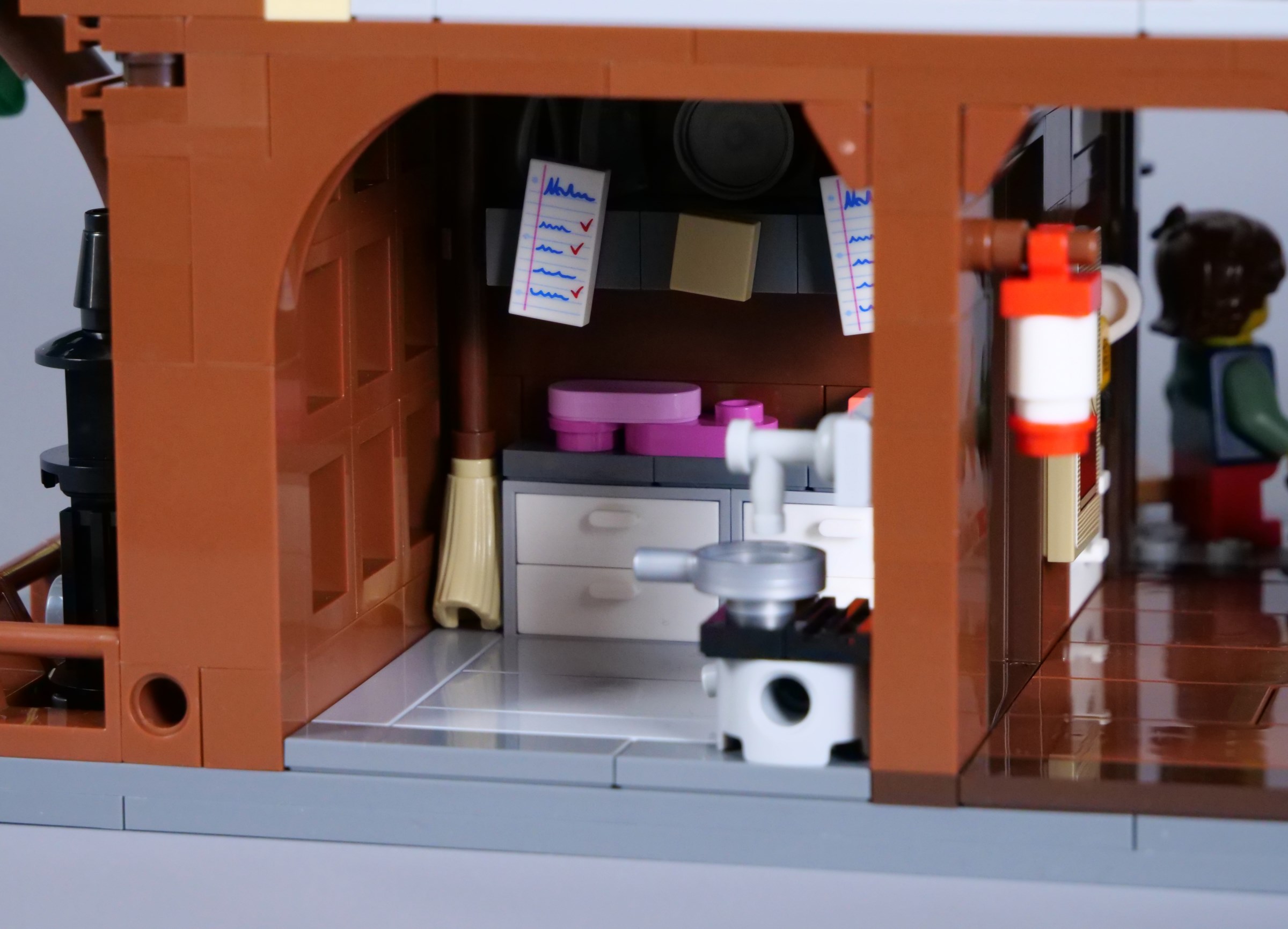 You can access the entrance vestibule from the front, behind a moveable wall. There is ample space for figures and the reception counter is a nice feature, rarely found in LEGO restaurants. The cupboard looks good too, even though the accessories inside are tucked away and hard to reach.