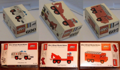 Here we see three different LEGO models, the Ambulance Set (360 in USA, 600 elsewhere), the Tow Truck Set (361 in USA, 601 elsewhere), the Delivery Van Set (362 in USA, 602 elsewhere). These sets show the different layout and English text (Model Makers) on the USA Samsonite sets, and the layout and lack of text on the continental European version. The British version now looked very much like the continental European boxes, but the Canadian boxes were still showing English/French text (Model Makers), but European set numbers. The 1970s were a confusing time for LEGO sets!