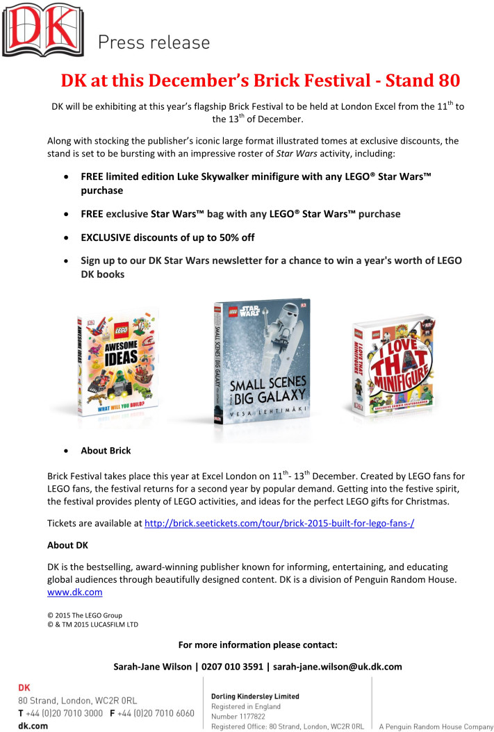 Posted by Huw,DK will be at Stand 80, close to the live stage, from Friday until Sunday selling a range of exclusively discounted DK LEGO books and giving away T-shirts, bags, and posters for free.