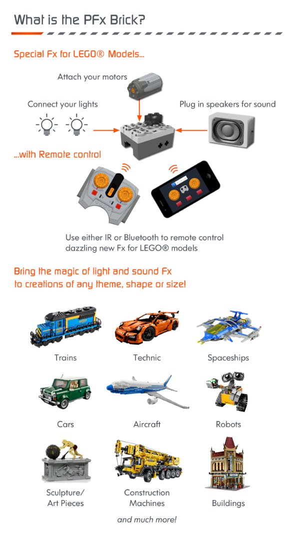 Isn't this an SBrick clone? etc. The PFx Brick is a lot more than just a motor control brick. We LEGO fans are lucky that we have a thriving ecosystem of alternative electronic controllers such as the awesome SBrick and BuWizz. These controllers are aimed specifically at motor control applications where multiple motor channels was a priority. The PFx Brick on the other hand, was designed to offer two new capabilities that we believe have been missing from LEGO models: advanced Lighting and Sound effects.