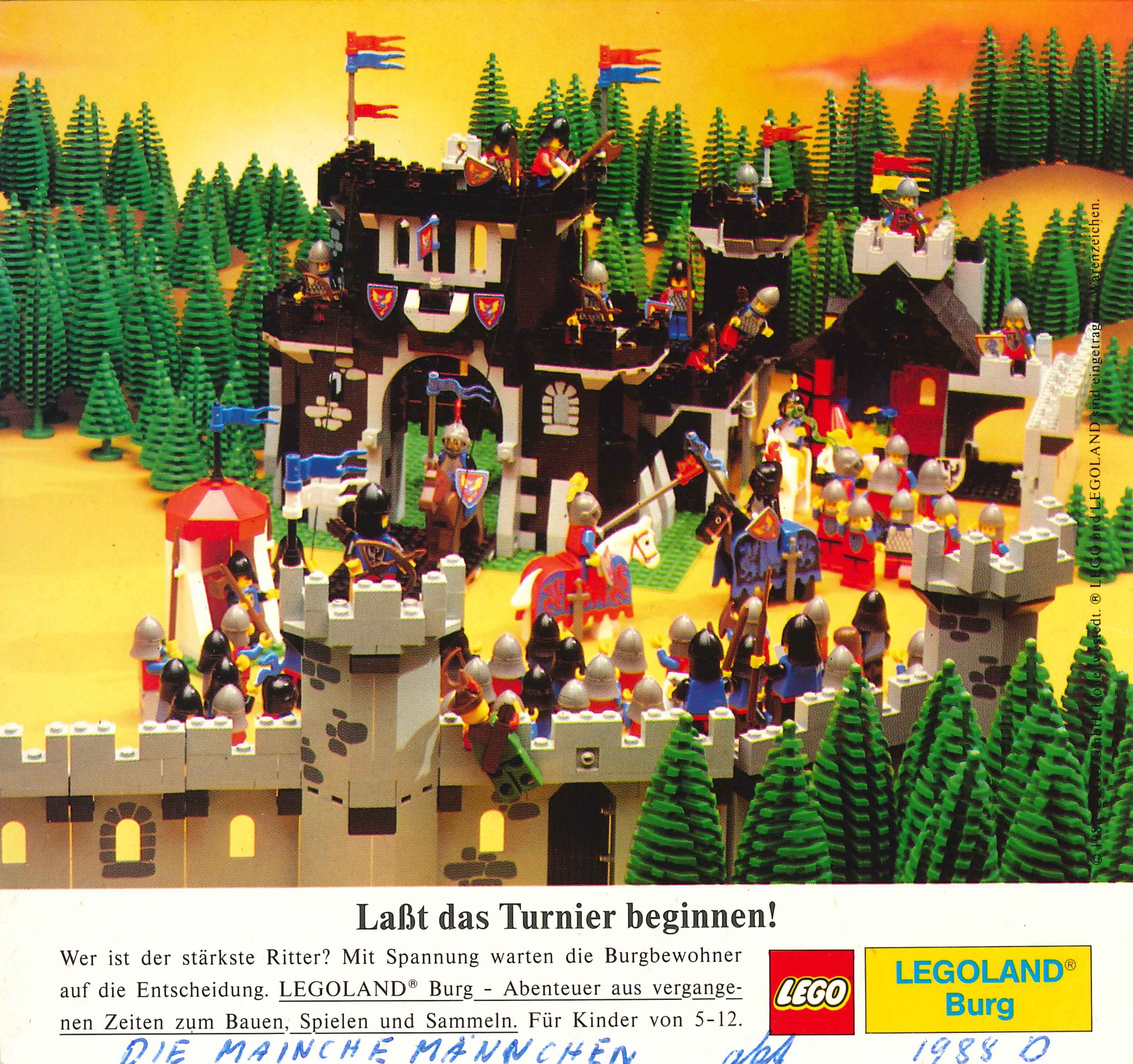 The castle is not under siege--the German text says that there is a joust happening! ("Let the tournament begin! Who's the mightiest knight? The castle's inhabitants are eagerly awaiting a decision. LEGOLAND Castle - build, play and collect adventures from yesteryear. For children aged 5-12.")