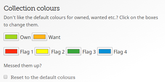 The default colours of green and orange for owned and wanted can be changed to anything you like on your profile > preferences page. The colours of the additional collection checkboxes can also be changed there, too.