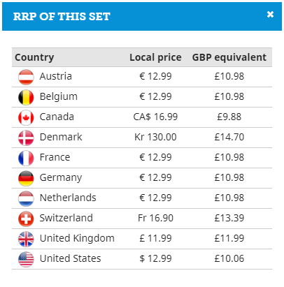 We are importing LEGO's product feeds for US/CA/UK/DE/FR, as before, and also now AT/BE/CH/DK and NL. This means we can now show prices for products in those countries too. You'll find a link to a box like that below next to the US/UK/DE prices in the set listings.