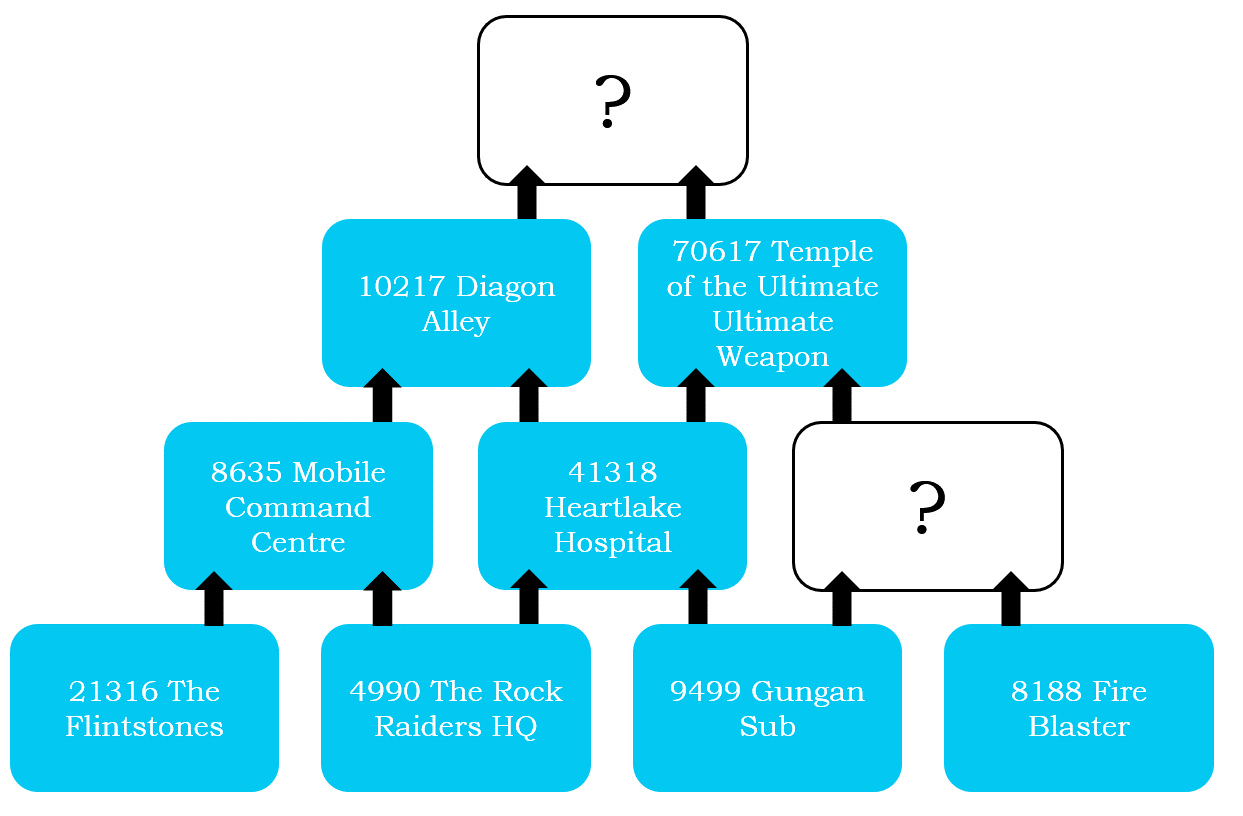 Clearly puzzles like this aren't my kind of strength, because I'm staring at that pyramid and can't see anything in common between any of those sets at all, never mind figuring out what's missing. I'm not sure if I'm supposed to be seeing some sort of complex pattern between the set names and numbers, or if it's something I should be seeing from studying the set images in detail instead.