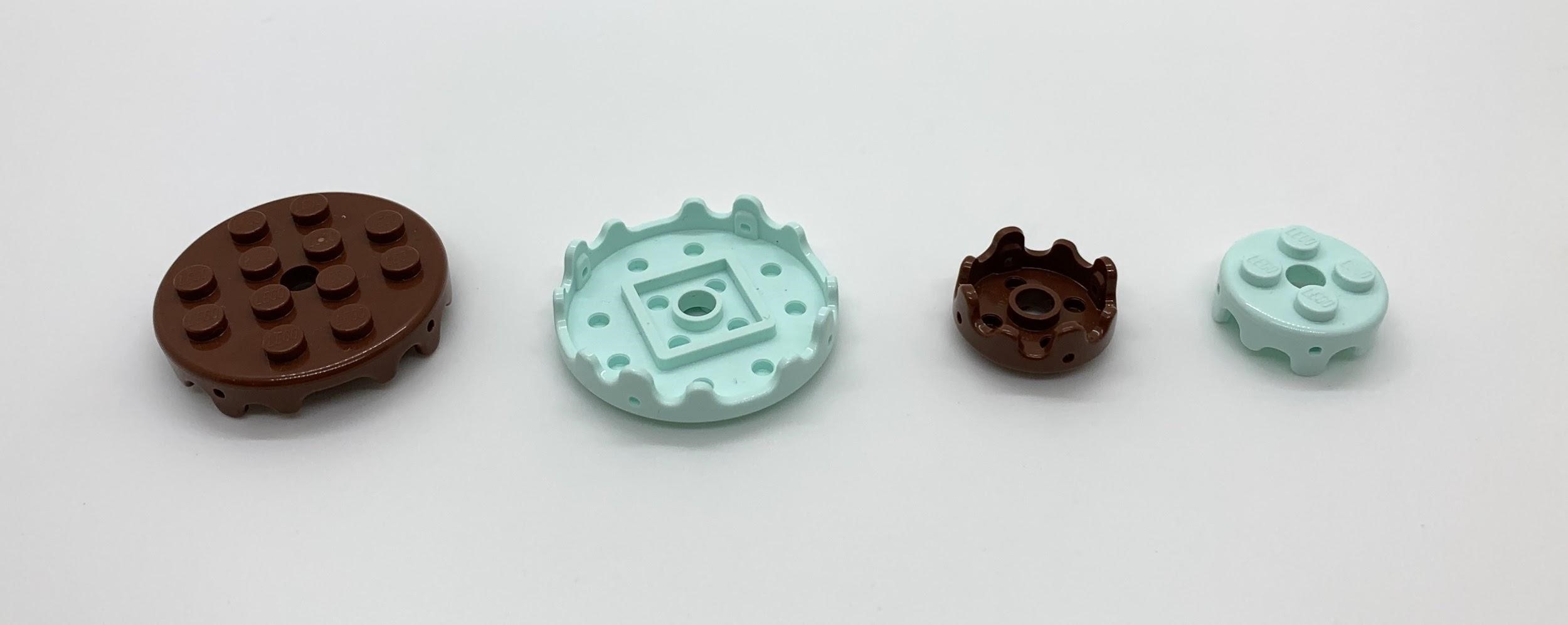 For both parts, you get one of each of the two available colours of Reddish Brown and Aqua, and the 4x4 versions are unique to this set. The Aqua 2x2 is also available in 41401 Stephanie's Play Cube - Baker, so it’s availability is also limited, though not as much. The parts look fantastic, accurately replicating cake icing when placed on top of a round brick of matching dimensions.