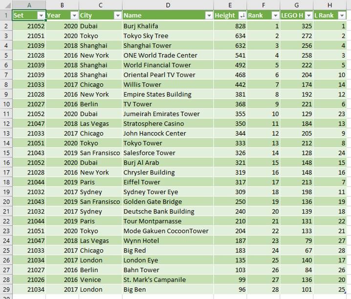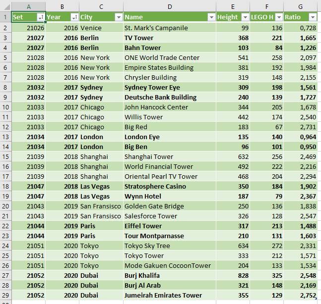 A last step is to see the relative difference in ranking between LEGO and the real life world. Those who are interested can make their Jumeirah Emirates Tower, Salesforce Tower and Willis Tower taller and find a way to make Sydney Tower Eye, London Eye, St. Mark's Campanile and Eiffel Tower shorter/smaller.