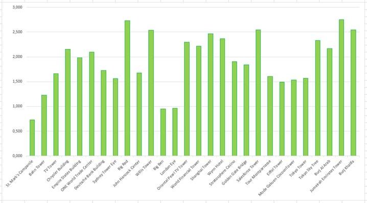 If we make a graphic we see that St. Mark’s Campanile, London Eye and the Big Ben should be much shorter while especially Big Red and Jumeirah Emirates Tower should be taller.