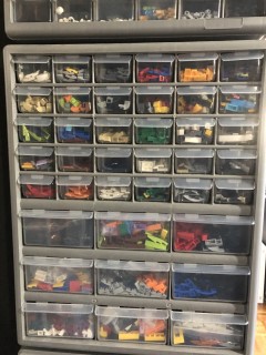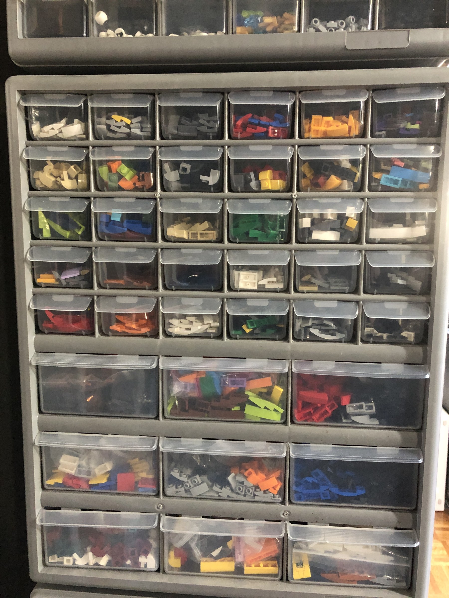 My storage is organised by type, size, element, and then colour. As a Type starts to get too big for its container, I start to sort it by size, and so on. Things like basic bricks and plates take up multiple storage units, while things like Mixel joints and click hinges are compartmentalized in a single drawer.