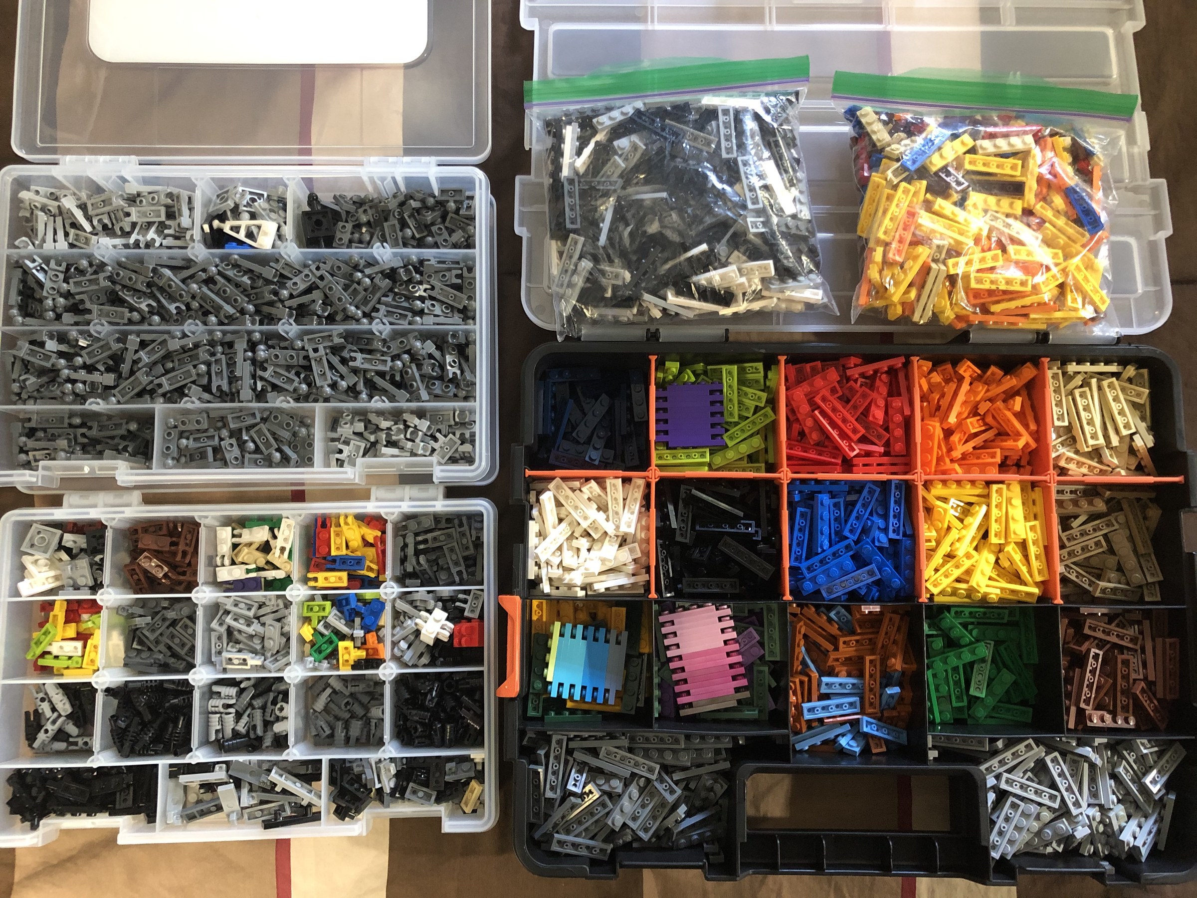 I use a hodge-podge of 12 different storage solutions, and I’m constantly shifting things between containers based on volume. Along with the standard Pick-A-Brick cups, Ziplocs of various sizes, and plastic shoeboxes, I also use two different sizes of locking hardware/tackle drawers, the new Dots bins, rolling craft organisers, multi-drawer organisers, two different sizes of collapsible cube storage bins, and a fair amount of dollar store plastic cubes. All of these work in coordination with a couple of large Ikea-esque cube storage shelves and a few larger basic shelf units.