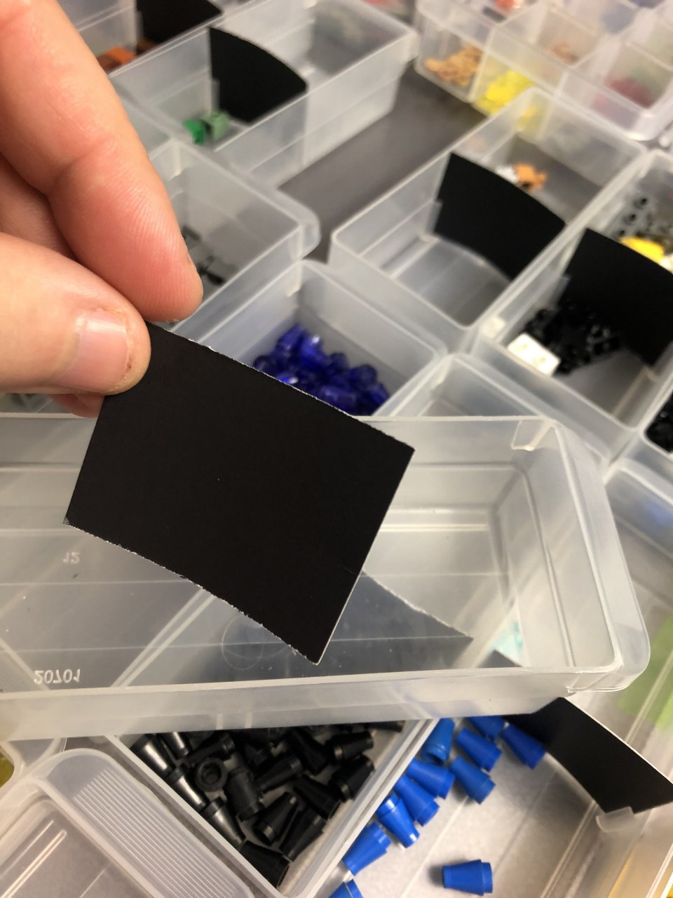 I place the plastic trays from small parts organisers in the drawers. Those organisers usually come with only a few of the extra plastic inserts so further divide the trays so my solution was black poster board.