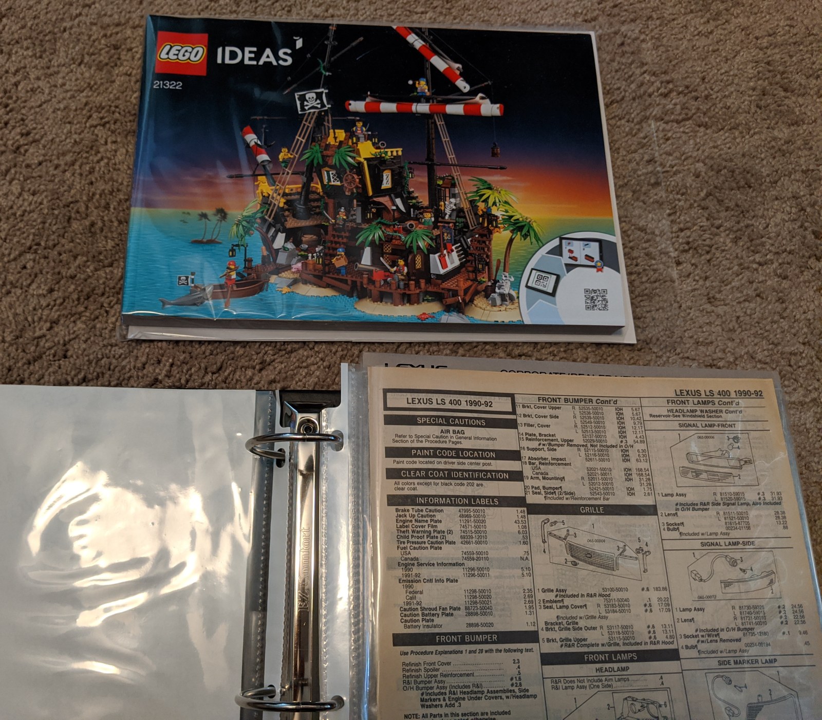 My partner snatched up the binders and page protectors for his car manual/parts list/press release collection and is quite pleased. I build in the living room by my computer and the TV, so I use the digital building instructions on one of my monitors to make more table room for pieces, which means I rarely remove the physical instructions from their new boards and bags.