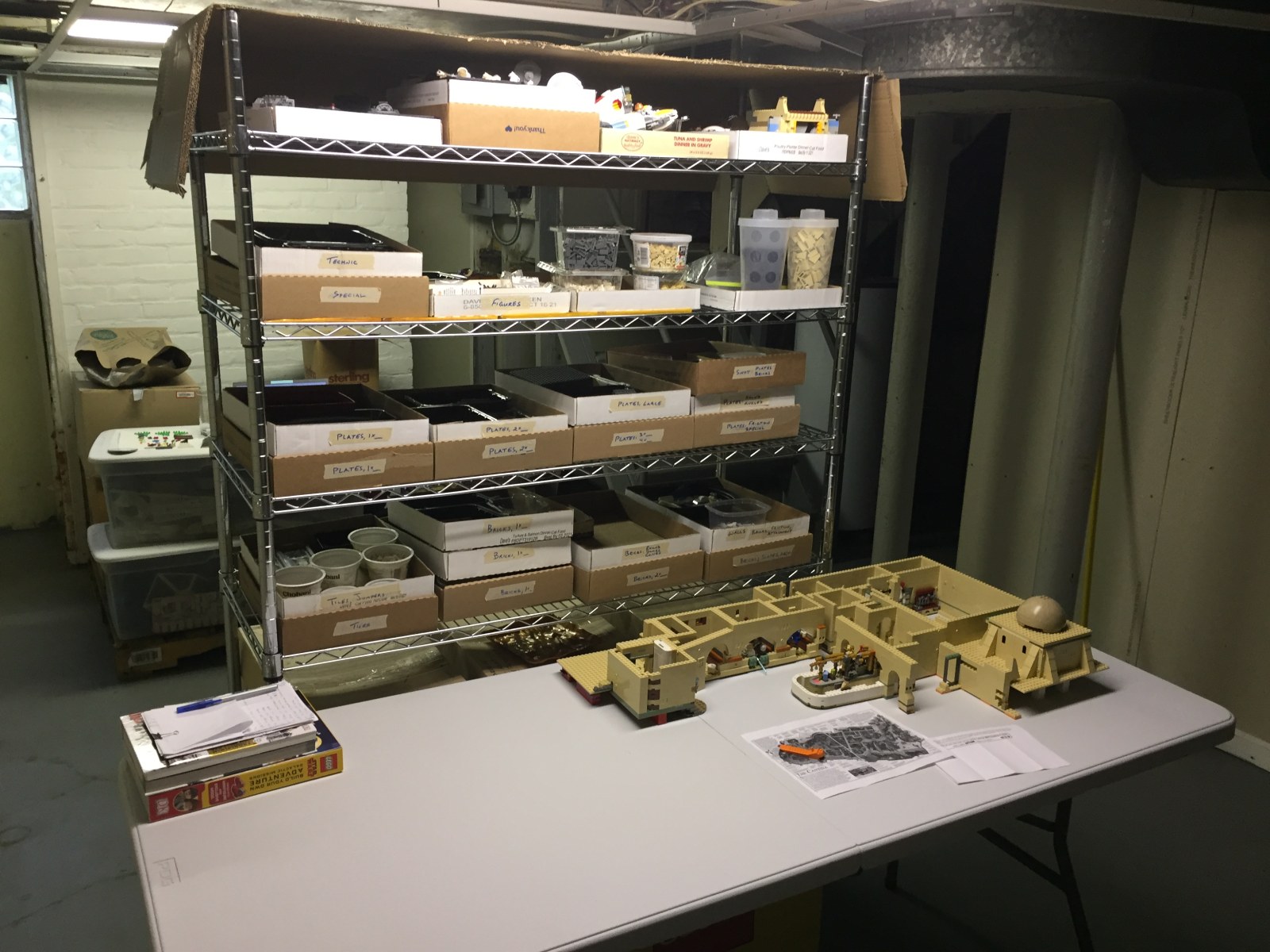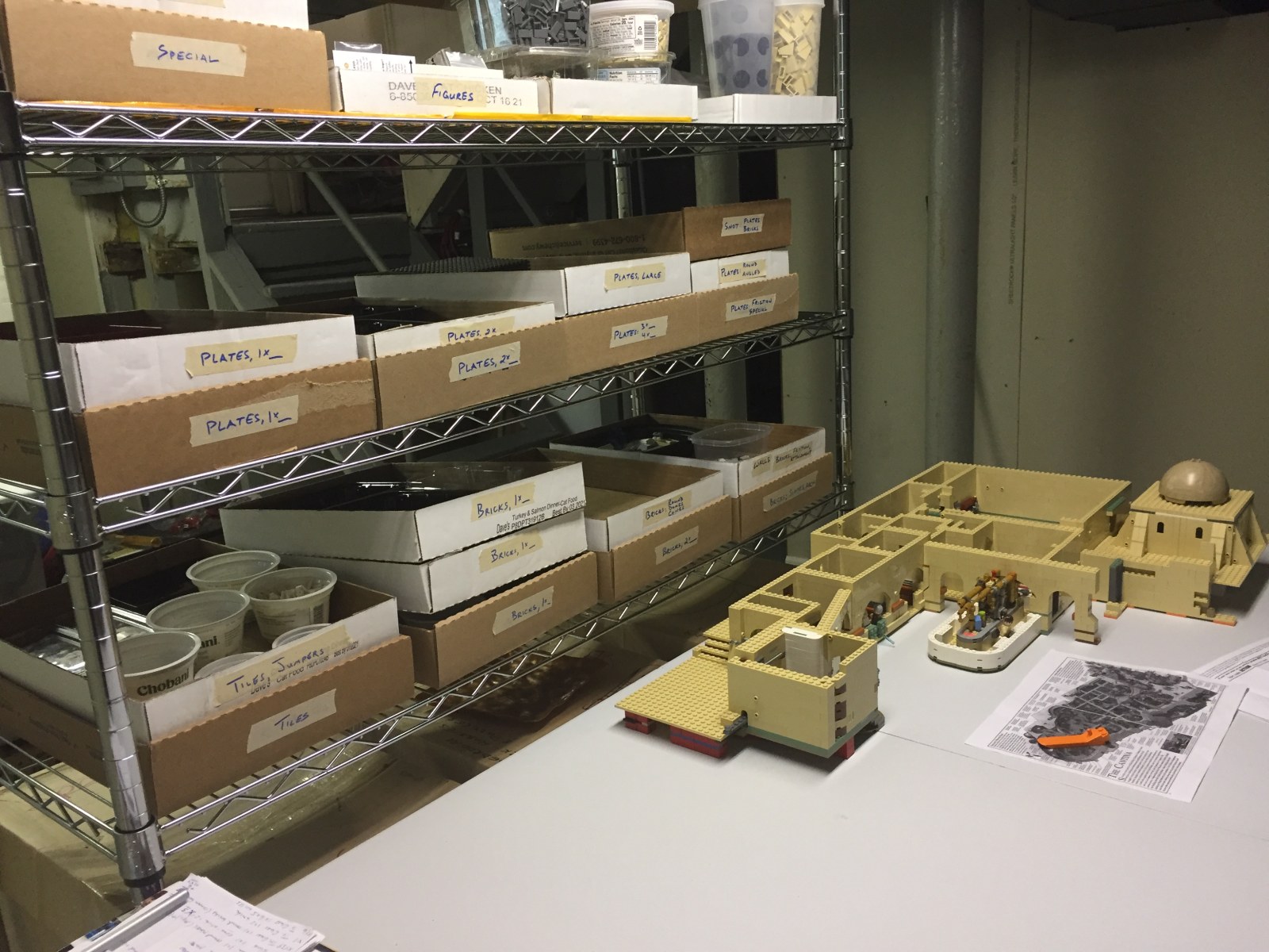 Presently, my trays are arranged on the shelves with tiles, jumpers, and bricks on one shelf, and plates on the shelf above. The parts that I use less often are farther up, which (for me) include Technic pieces and other speciality parts, but this may be different for you. On the very top shelf I store smaller builds that will ultimately be incorporated into my Mos Eisley build. The entire shelving unit is topped by a large cardboard sheet that will hopefully keep most of the dust from falling through the old hardwood floors above into the open trays.