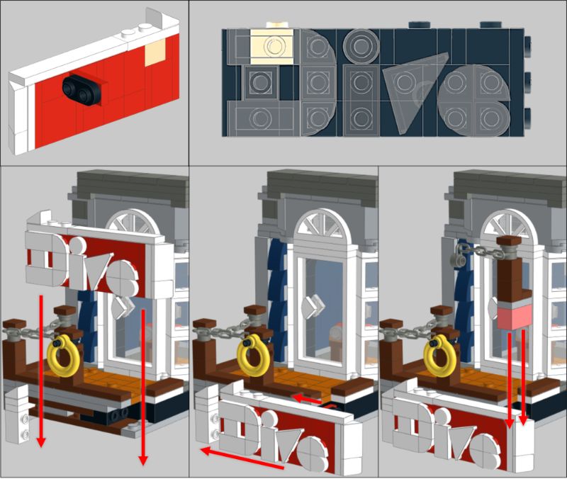 The left corner features a deck with colourful beach furniture. Located below the deck is the bold “Dive” sign, designed to evoke the look and feel of the dive flag. The sign uses plenty of SNOT bricks in seemingly random positions to form the mounting points for the lettering tiles. The tubeless underside of the 1x2 tile proves useful here, as can be seen in the following image: